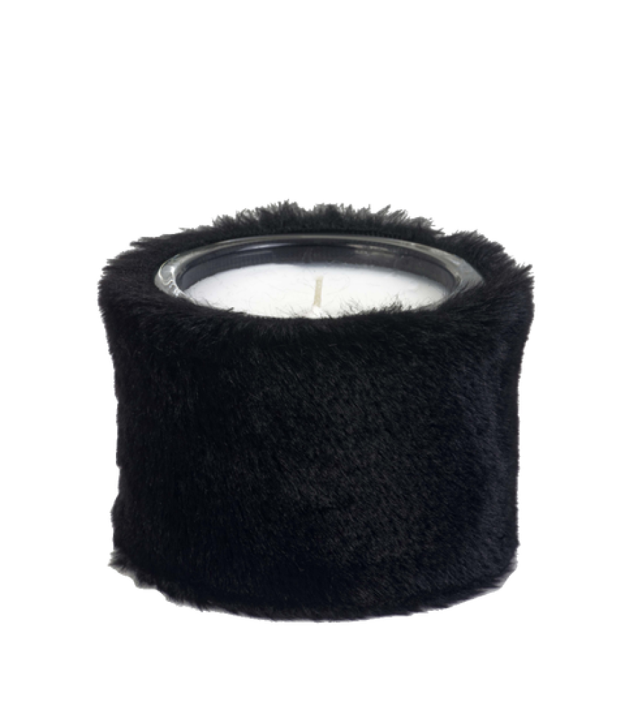 Candela Profumata in vaso di vetro da 200gr.rivestito in eco-pelliccia nera rimovibile.