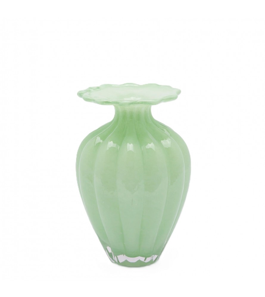 IL VASO BLOSSOM H24,5 DI ENZO DE GASPERI incarna un'eleganza discreta ma di grande impatto visivo. Realizzato in pregiato vetro artistico verde chiaro, questo vaso si distingue per la sua superficie solcata da costolature verticali che creano affascinanti giochi di luce e ombre. La finitura opalescente e il bordo superiore delicatamente ondulato richiamano la morbidezza di un bocciolo in fiore, rendendolo un elemento d'arredo sofisticato e senza tempo.