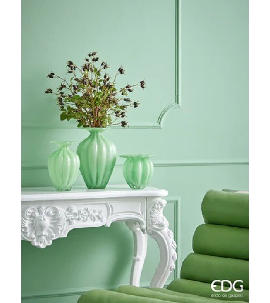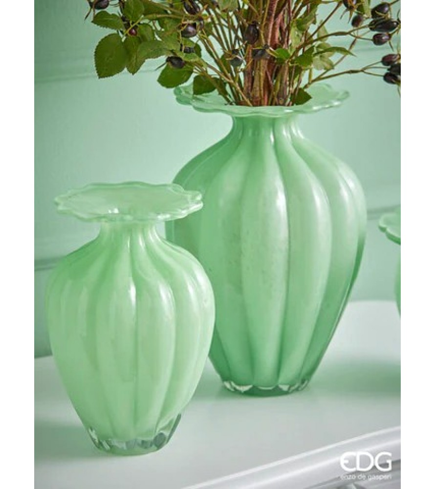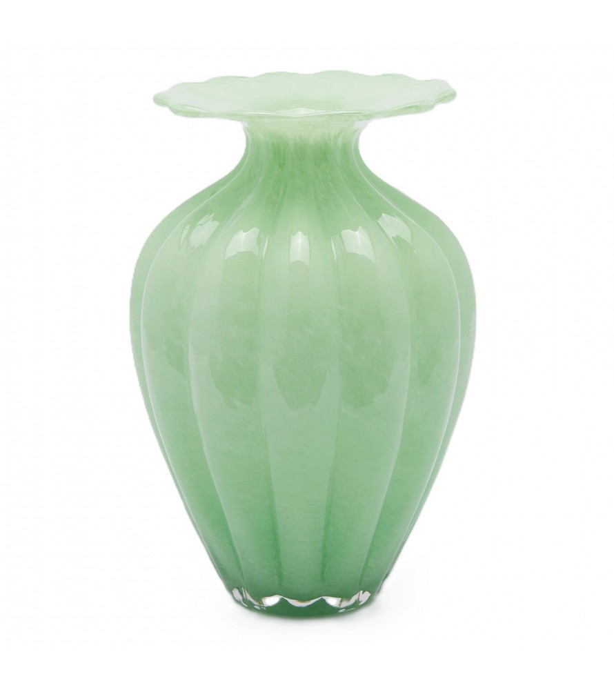 IL VASO BLOSSOM DI ENZO DE GASPERI è un complemento d'arredo che cattura lo sguardo per la sua eleganza scultorea e la delicatezza cromatica. Caratterizzato da una silhouette sinuosa con costolature verticali che ne slanciano la forma, questo vaso è realizzato in vetro di alta qualità in una luminosa tonalità verde chiaro. La finitura leggermente opalescente dona profondità al materiale, rendendolo un pezzo unico capace di dialogare con stili sia classici che contemporanei.