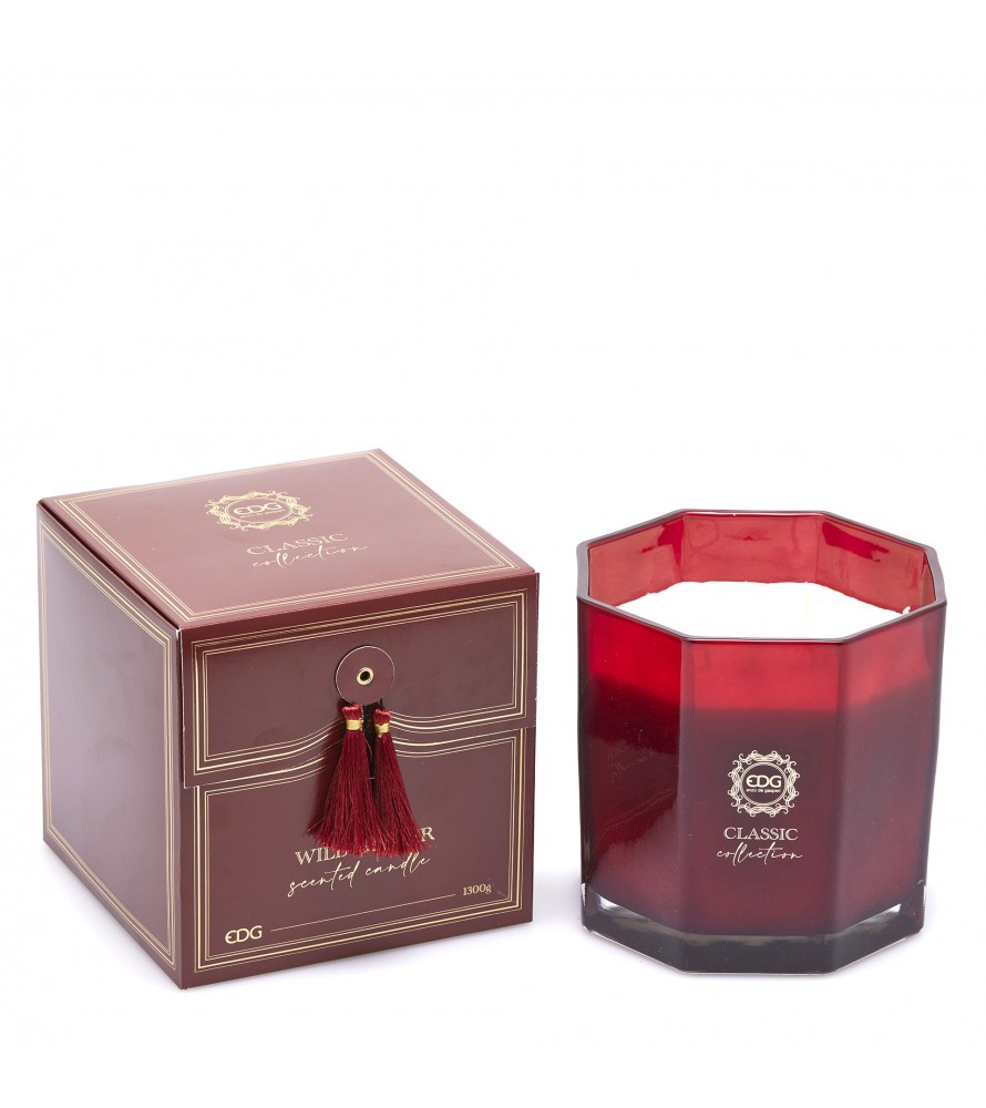 Nuova candela profumata di Edg con 4 stoppini in vaso di vetro, confezionata in elegante scatola regalo.