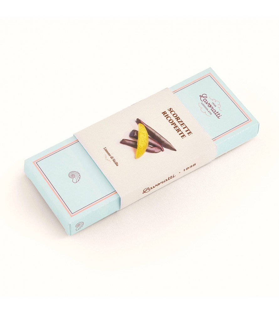 Ricoperte al fondente, le scorzette Lavoratti offrono il meglio della materia prima selezionata e fornita da Corrado Assenza. Giungono da Noto immerse nel loro sciroppo di cottura per essere accolte nel laboratorio dove vengono preparate e ricoperte di finissimo cioccolato fondente.