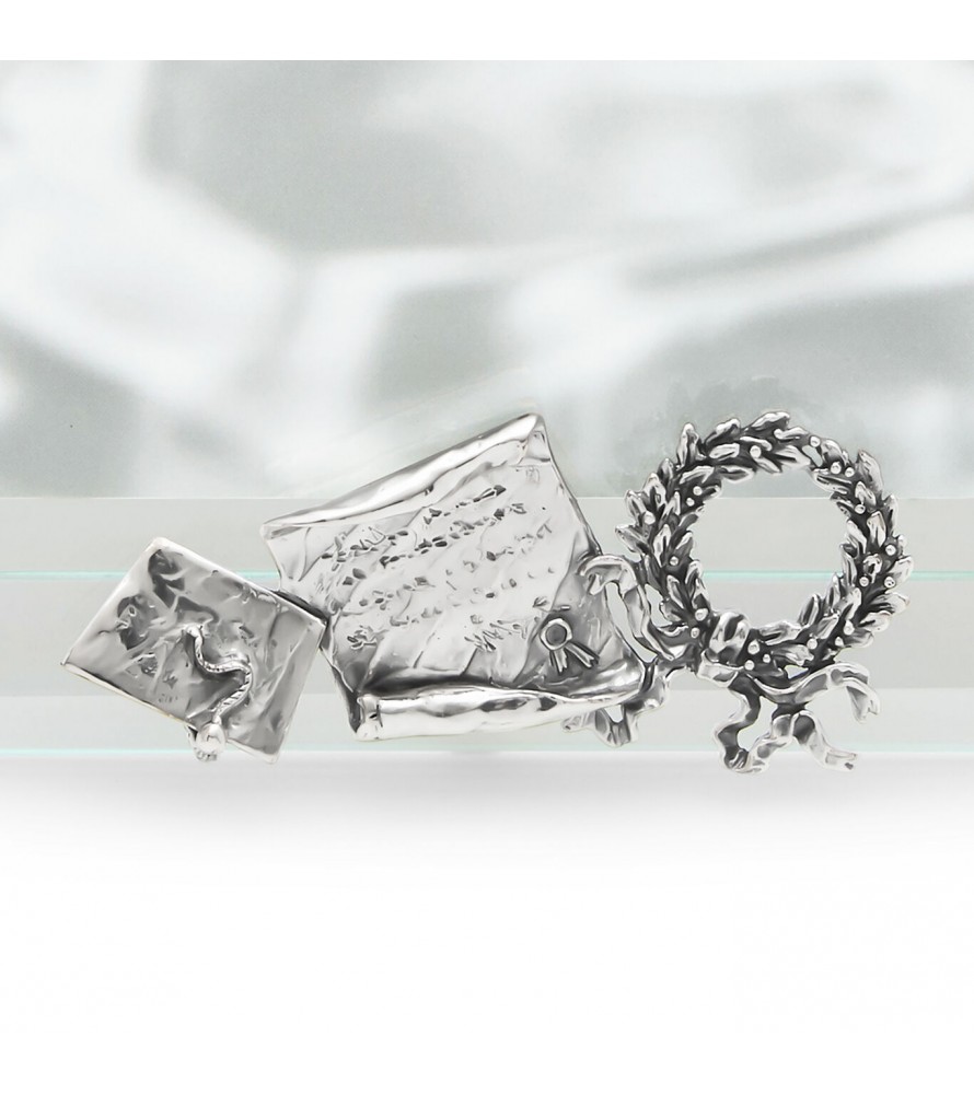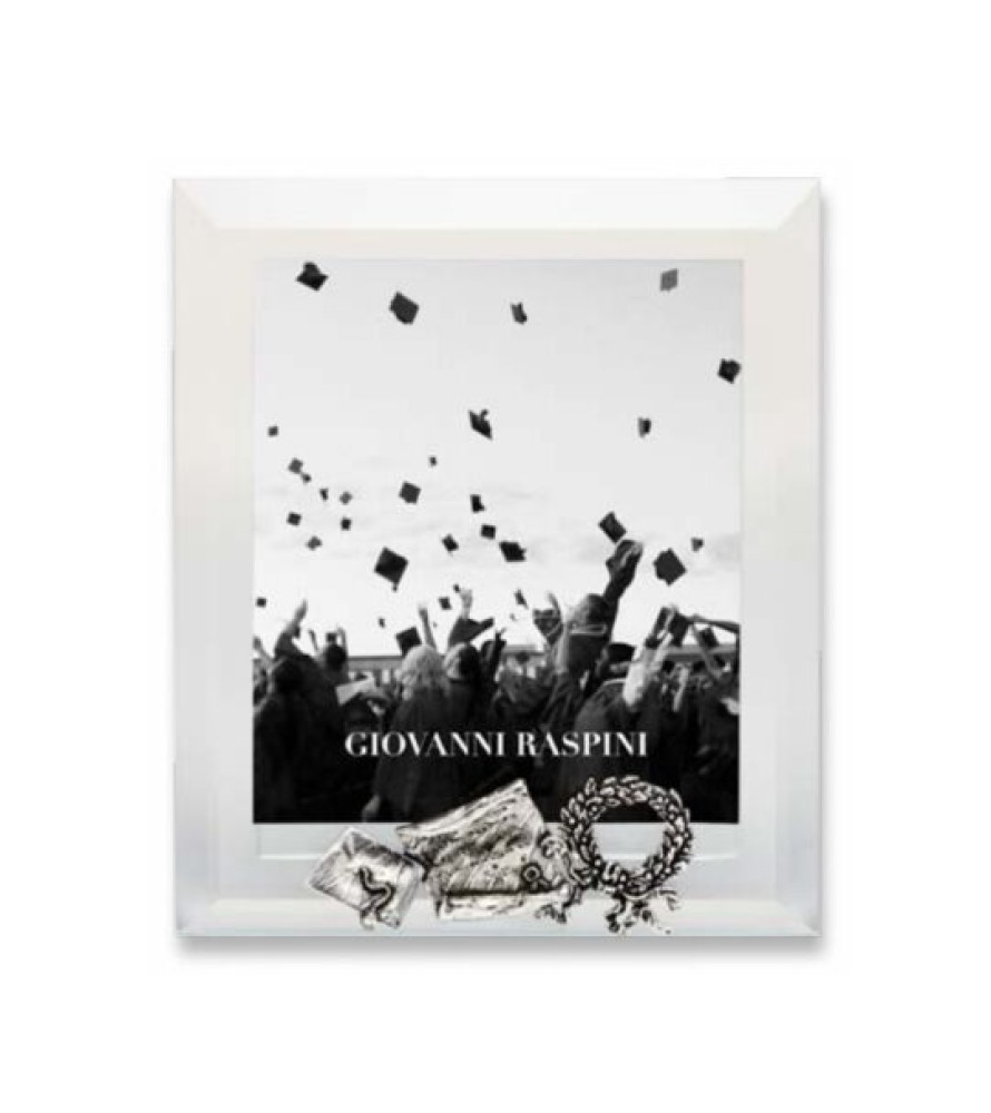 Tre elementi iconici della cerimonia di laurea, resi in argento, rendono unica questa cornice caratterizzata dalla grande luminosità dei bordi in vetro trasparente. Il decoro, posto centralmente sul lato inferiore, viene realizzato a mano con l'antica tecnica della fusione a cera persa e successiva brunitura.