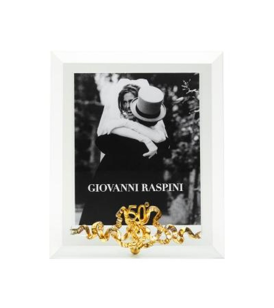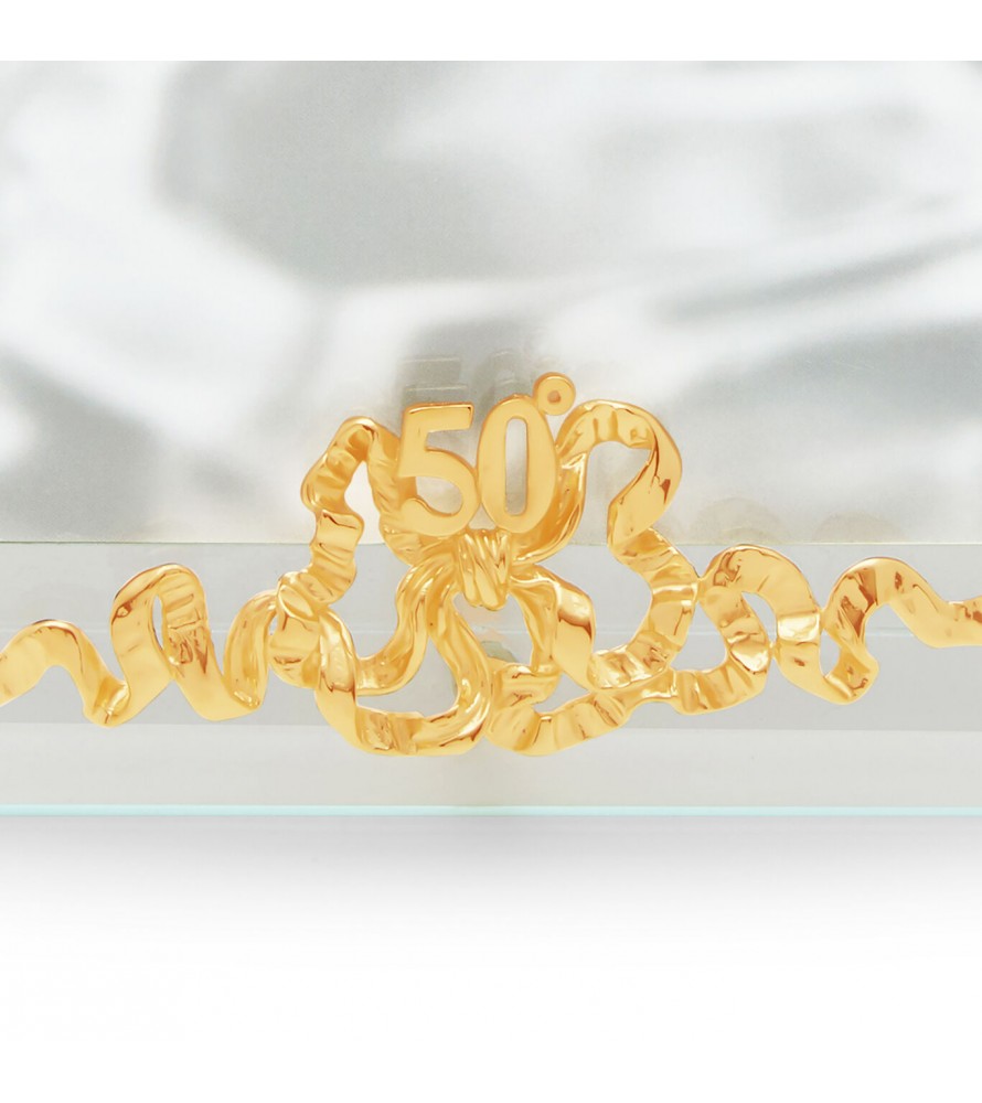 Un elegante nodo in argento dorato, sormontato dal numero 50, rende unica questa cornice caratterizzata dalla grande luminosità dei bordi in vetro trasparente. Il pregevole decoro, posto centralmente sul lato inferiore, è realizzato a mano con l'antica tecnica della fusione a cera persa e successiva doratura.