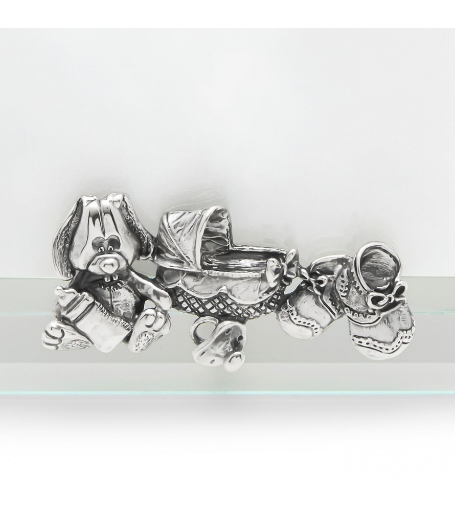 Quattro divertenti simboli dell'infanzia, resi in argento, rendono unica questa cornice caratterizzata dalla grande luminosità dei bordi in vetro trasparente. Il decoro, posto centralmente sul lato inferiore, viene realizzato a mano con l'antica tecnica della fusione a cera persa e successiva brunitura.