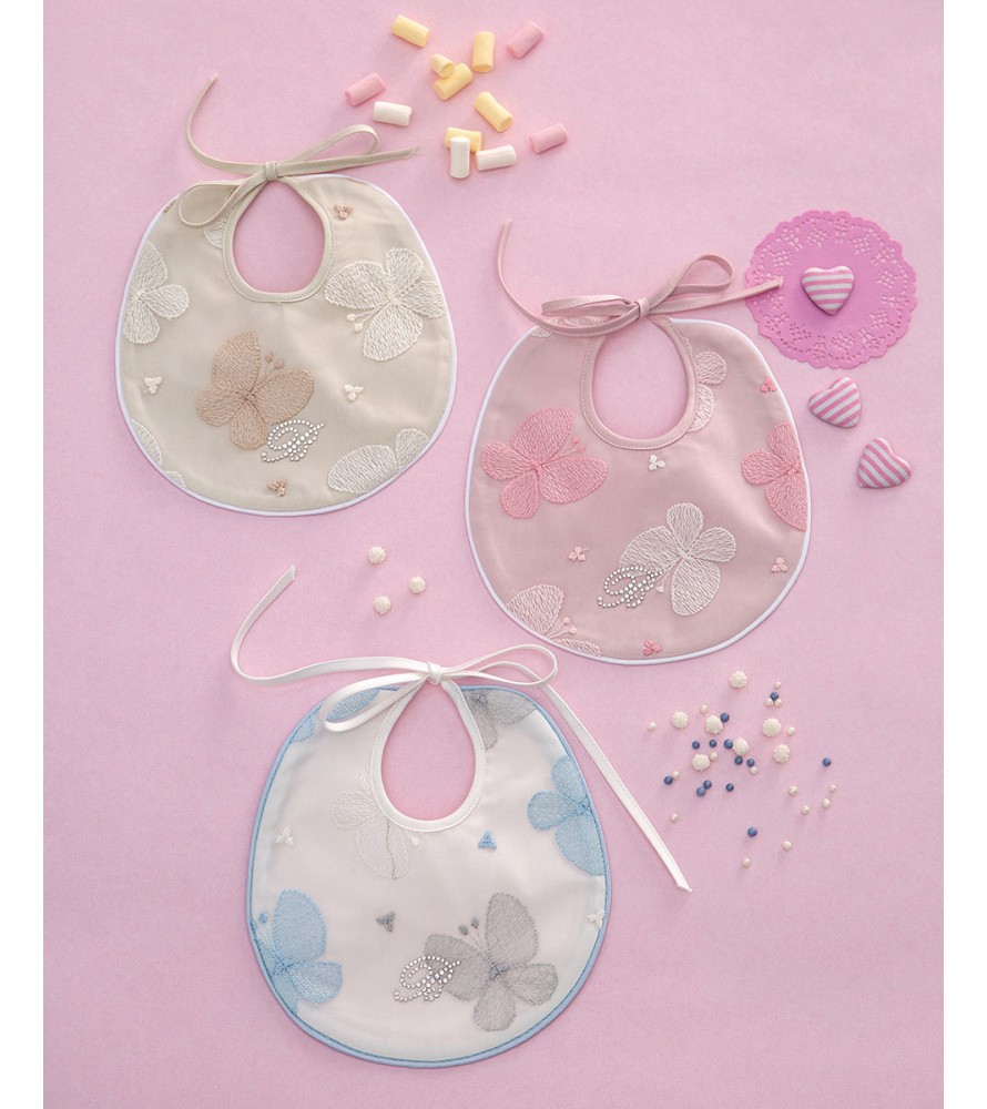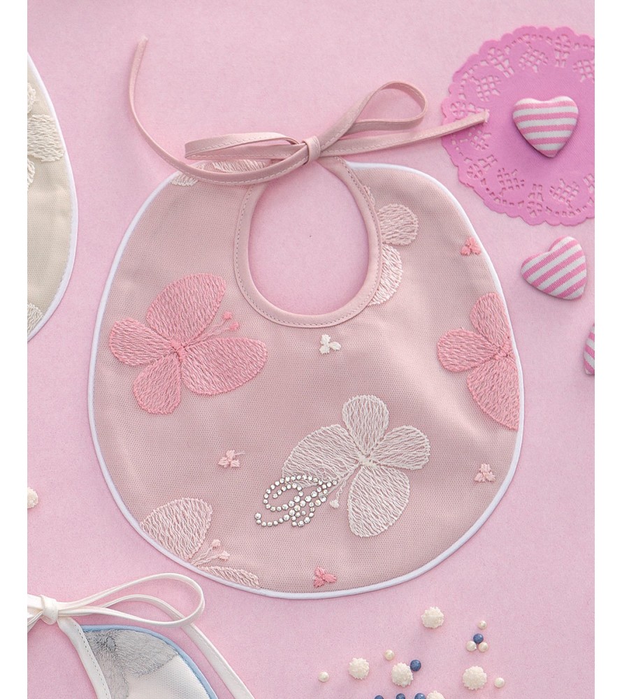Bavaglino per neonato con parte davanti in tulle ricamato con logo Blumarine in cristalli Swarovski, retro in raso tinta unita.