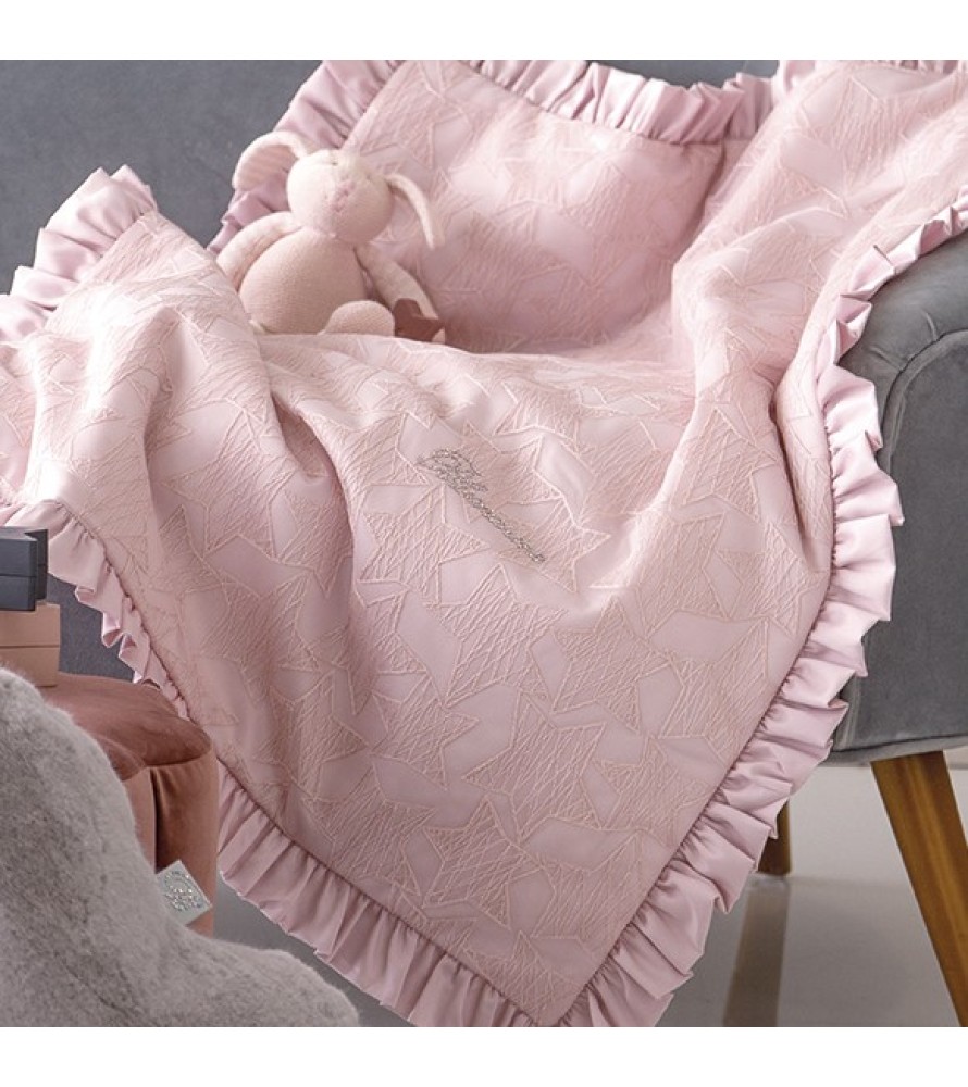 La coperta Baby Stellina di Blumarine Baby è una bellissima e preziosa coperta imbottita per culla e carrozzina realizzata in tulle ricamato con stelle, con volant e logo Blumarine in cristalli. Il retro è in raso di cotone tinta unita.
