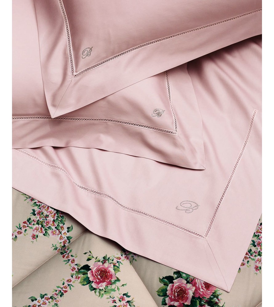 Raffinato completo lenzuola matrimoniale in raso di cotone con finitura a croquette e logo Blumarine in cristalli Swarovski su lenzuolo sopra e federe.