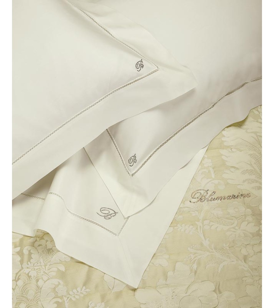 Raffinato completo lenzuola matrimoniale in raso di cotone con finitura a croquette e logo Blumarine in cristalli Swarovski su lenzuolo sopra e federe.
