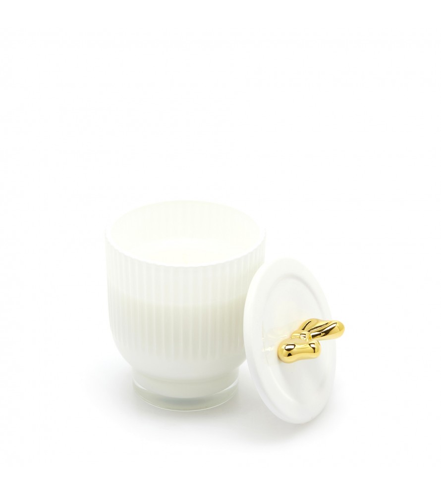 Il contenitore è in vetro bianco lucido, con una finitura a costine verticali che aggiunge un tocco di raffinatezza e ne esalta la lucentezza.Sulla parte superiore del coperchio si trova una decorazione a forma di fiocco,che funge anche da pomello per aprirlo. Questo dettaglio dorato crea un bel contrasto con il bianco, aggiungendo un tocco di lusso e originalità. Confezionata scatola regalo.