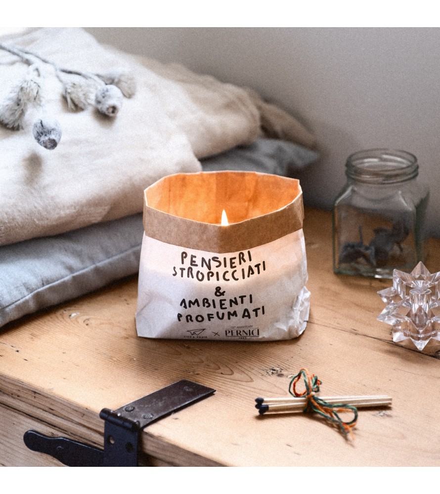 UN’ESSENZA AVVOLGENTE PER AMBIENTI CHE RACCONTANO STORIE. La candela "Pensieri Stropicciati & Ambienti Profumati" di Cereria Pernici è una celebrazione della convivialità e del calore domestico. Caratterizzata dalla sofisticata fragranza Black Pepper & Tonka Bean, questa creazione sprigiona note speziate e legnose che trasformano ogni stanza in un rifugio accogliente. Il design materico, custodito nell'iconico sacchetto di carta ignifuga, rende questa candela un elemento d'arredo unico, capace di illuminare non solo lo spazio, ma anche i momenti di condivisione più preziosi.