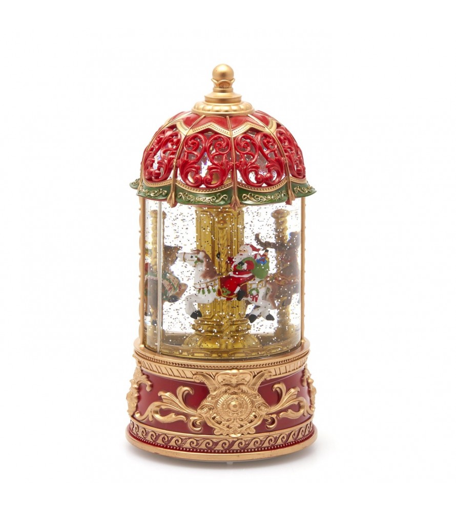 Al centro della cupola trasparente si anima una classica giostra con cavallini e personaggi festosi in rotazione. Questo movimento, tipico dei carillon, dona vita alla scena.La parte interna in vetro è riempita di liquido e glitter scintillanti che, una volta attivata la giostra, creano un suggestivo effetto neve che turbina continuamente.