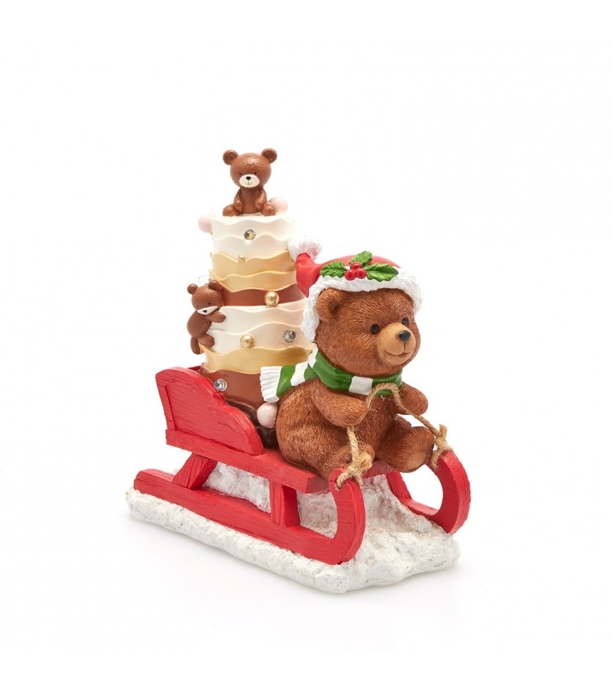La statuetta, realizzata in poliresina, raffigura un adorabile orsetto goloso che si sta godendo una divertente corsa in slitta.Vestito per il freddo con un cappello da Babbo Natale e una sciarpa verde, l'orsetto è seduto su una slitta rossa che scivola su un tappeto di neve bianca. Al suo fianco, una deliziosa torta a più piani, decorata con dettagli dorati e strass, completa la scena.