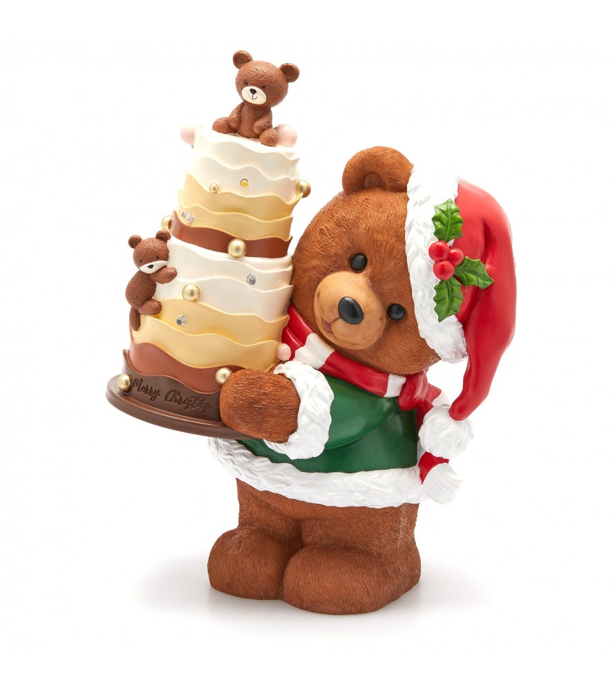 Realizzato in poliresina, il decoro raffigura un simpatico orso vestito a festa con un cappello da Babbo Natale e una sciarpa rossa e verde.