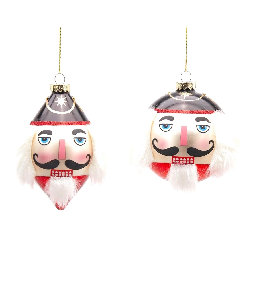 Bellissimo Coppia di Decorazioni di Testa di Soldatini Schiaccianoci realizzate in Vetro Soffiato, dipinte a mano ed impreziosite con dettagli in eco-pelliccia.