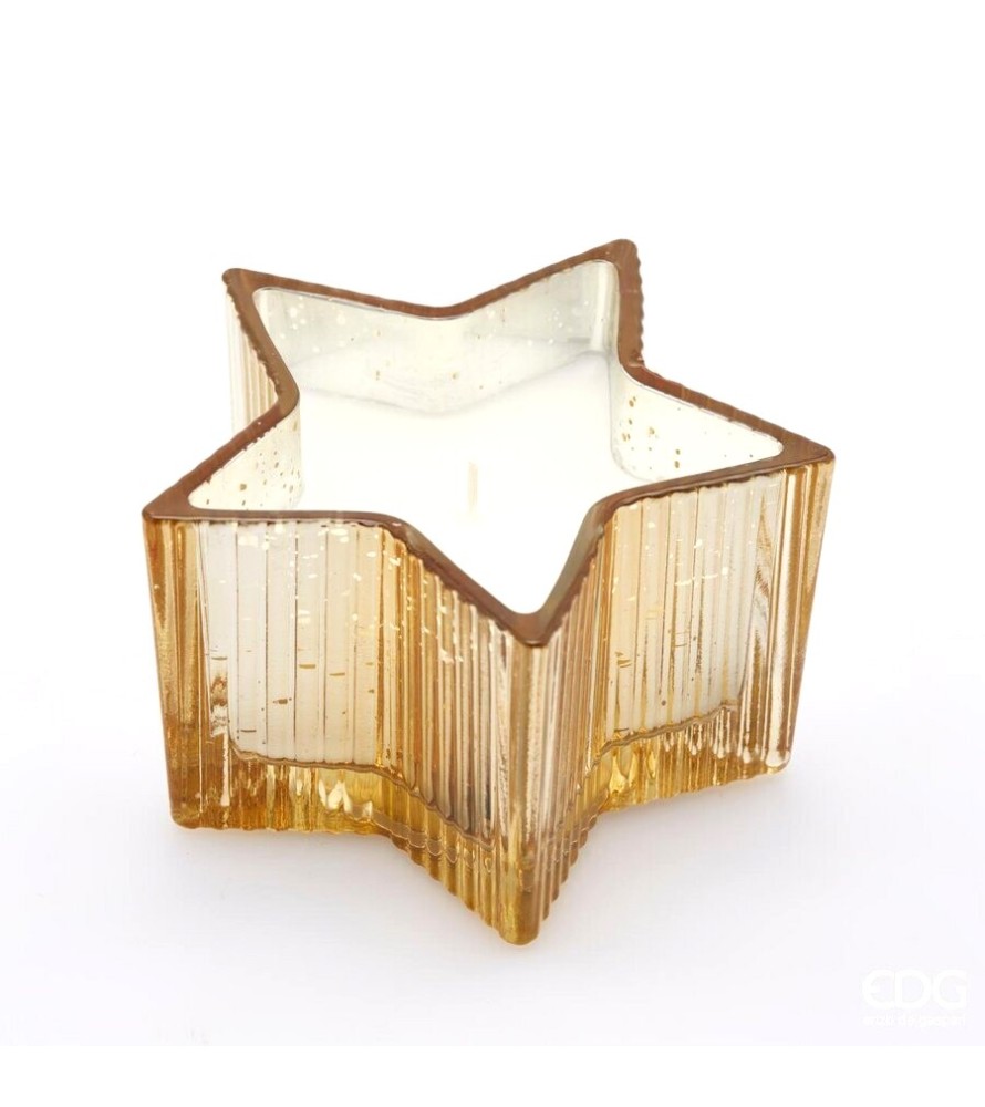Candela Profumata con 1 stoppino in vaso di vetro a forma di stella, confezionata in scatola regalo. Il Vaso una volta terminata la candela potrà essere riutilizzato.