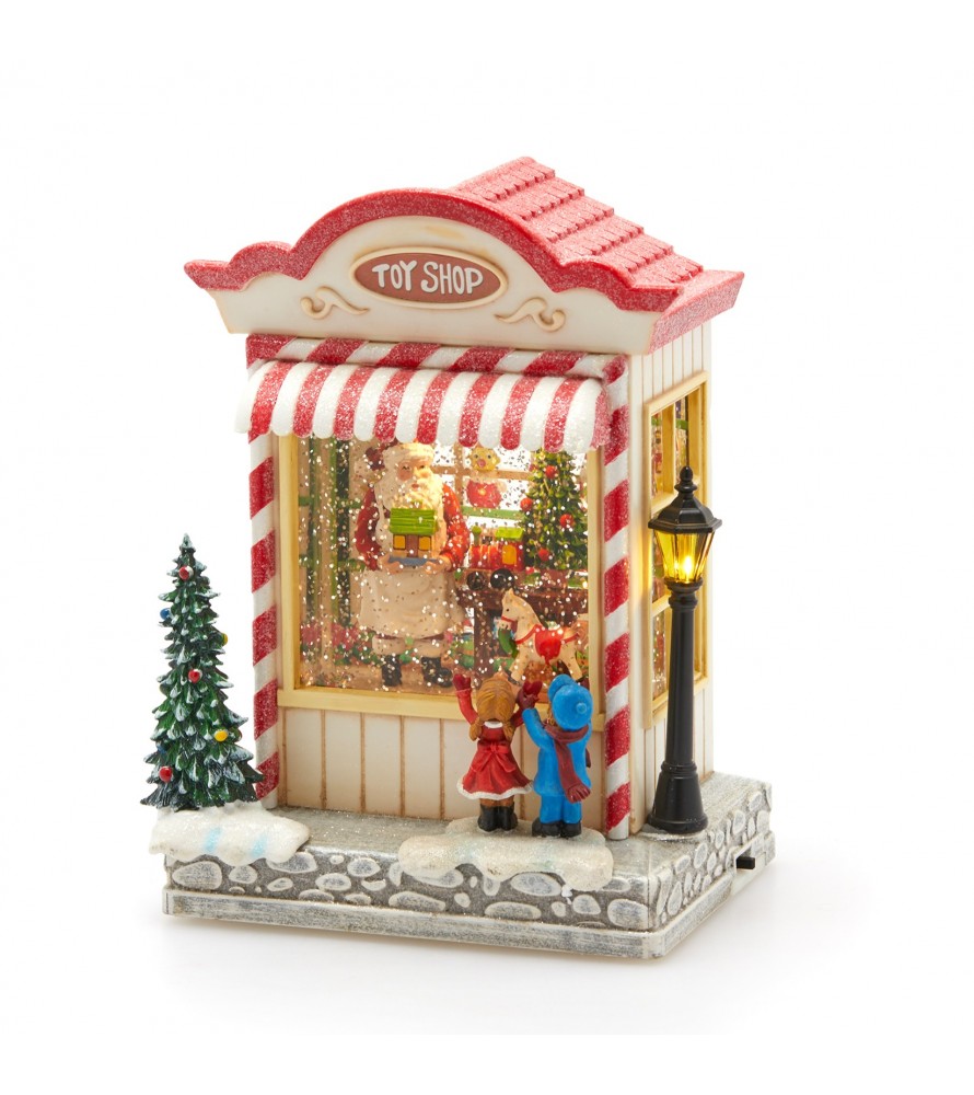 Il design include una tenda a strisce rosse e bianche, la scritta "Toy Shop" e un albero di Natale innevato, tutti elementi che contribuiscono a creare un'atmosfera da fiaba. Un regalo ideale per chi ama le decorazioni che raccontano una storia.