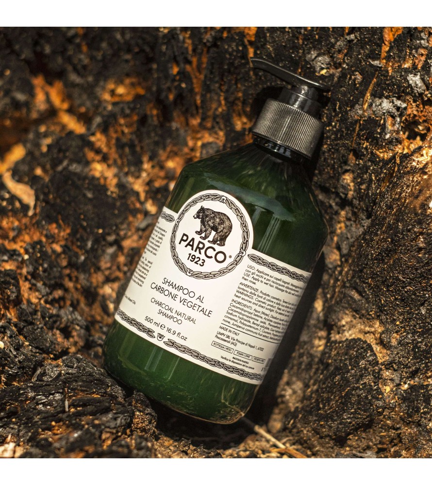 Le note profumate della fragranza PARCO1923 vengono infuse in uno shampoo dal caratteristico colore nero, grazie all’aggiunta di polvere purissima di carbone vegetale. Agendo come un magnete, il carbone vegetale attira e assorbe le impurità organiche e inorganiche dell’ambiente circostante come smog o particelle inquinanti, donando una prolungata sensazione di pulizia e freschezza.