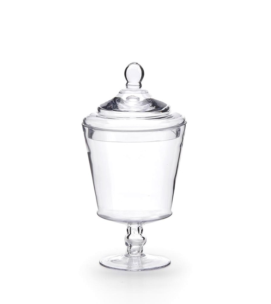 Contenitore con coperchio dalla linea svasata realizzato in vetro trasparente e brillante.