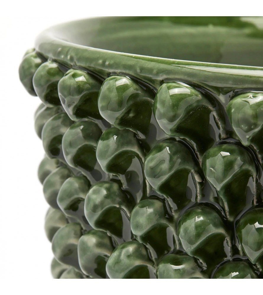 Vaso in ceramica waterproof decorato in rilievo realizzato a mano.Il vaso presenta un motivo a pigna con piede, simbolo di abbondanza e prosperità, realizzato con grande attenzione ai dettagli. Un oggetto home decor originale, che dona colore ed eleganza agli ambienti della tua casa. Perfetto per essere utilizzato come vaso porta fiori e piante, o anche semplicemente lasciandolo libero in tutta la sua bellezza.