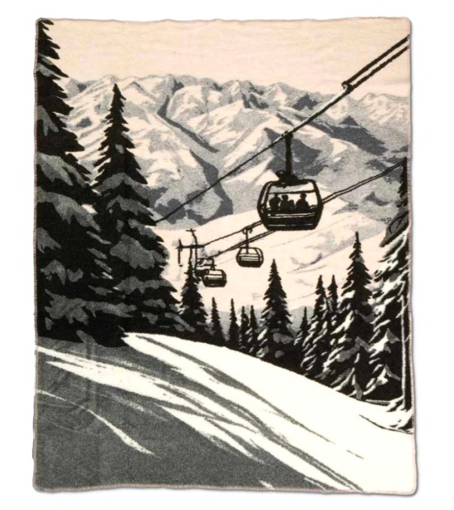 Il design del plaid è dominato da una scena di montagna rappresentata in uno stile che ricorda le illustrazioni classiche. Al centro dell'immagine, spiccano delle funivie in movimento, con le cabine che trasportano passeggeri attraverso il paesaggio innevato.