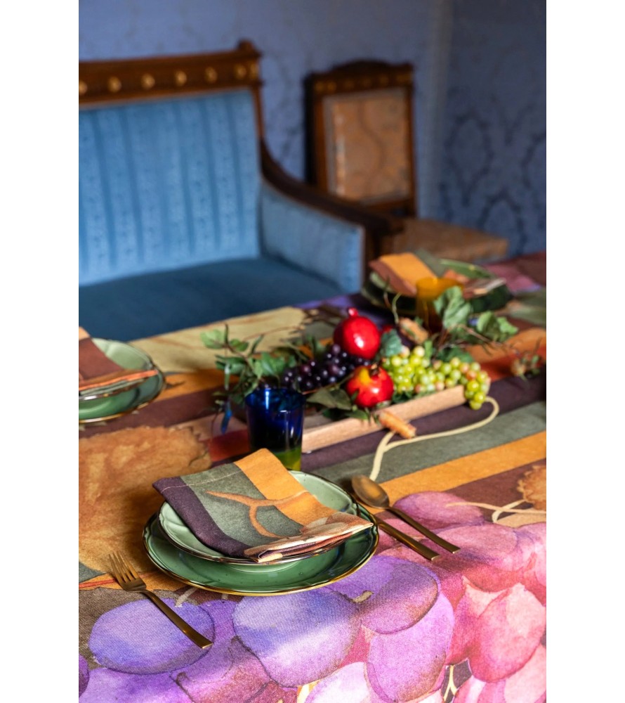 Nuova Tovaglia Bacco The Napking con elegante stampa realizzata in 100% lino. Tutte le tovaglie di The Napkin sono confezionate in splendide scatole regalo serigrafate.