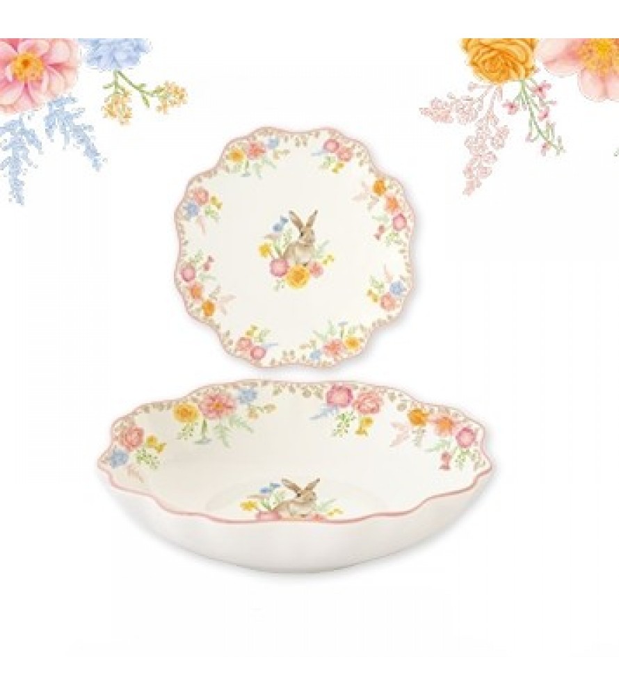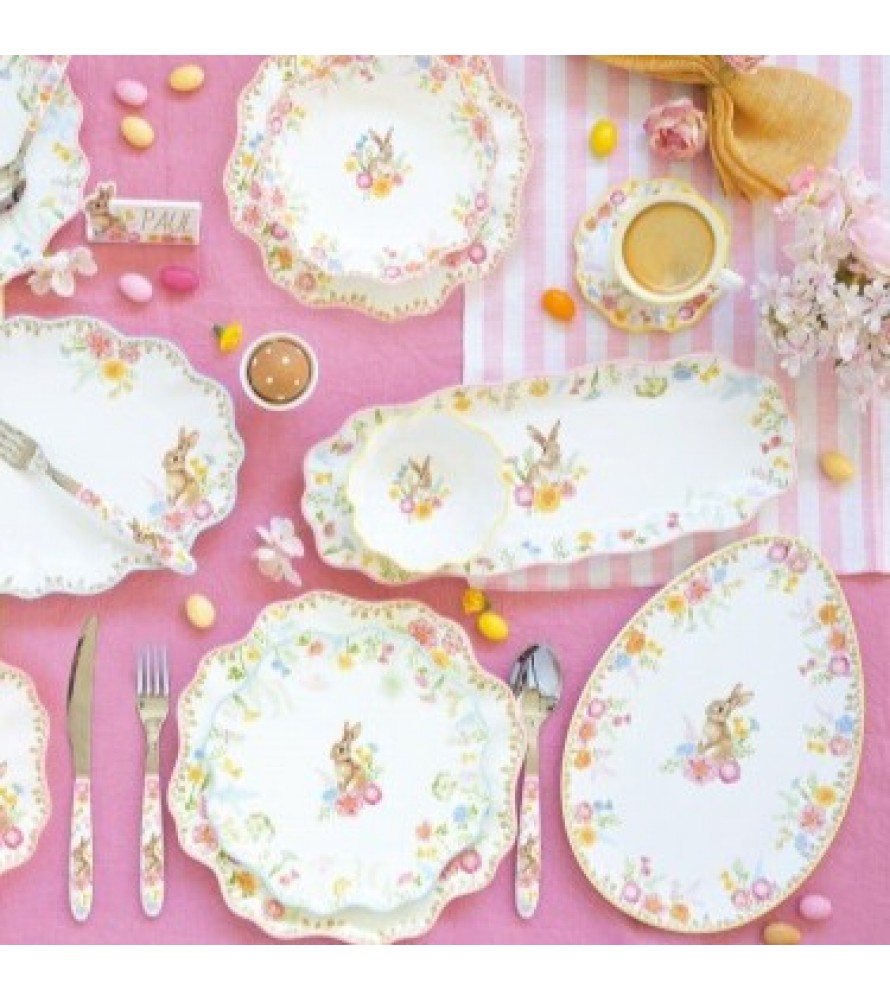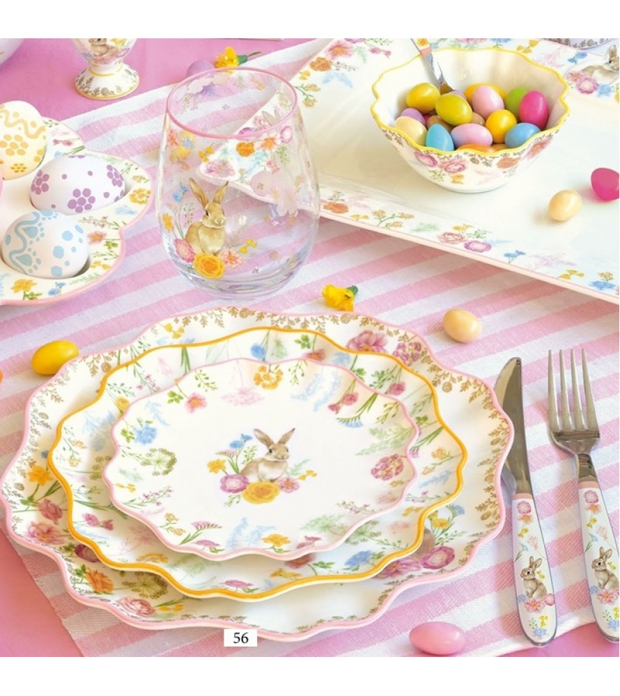 IL SERVIZIO PIATTI TRES JOLIE EASY LIFE trasforma la tavola in un giardino incantato. Questo set da 18 pezzi, realizzato in finissima porcellana, celebra la delicatezza della primavera attraverso illustrazioni acquerellate di teneri coniglietti immersi tra fiori di campo e bordi finemente sagomati. Ogni pezzo è studiato per offrire un'esperienza visiva armoniosa, rendendo ogni pasto un'occasione speciale, dalla colazione pasquale alle cene più raffinate.