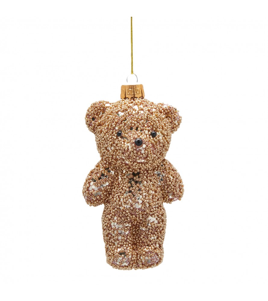 Nonostante le perline, i dettagli del musetto, gli occhietti neri e la forma tradizionale dell'orso sono ben definiti, conferendo al decoro un aspetto giocoso ma elegante. Alto 14 cm, è la dimensione ideale per risaltare su qualsiasi tipo di albero, da quello classico a quello più moderno. È pronto per essere appeso grazie al pratico gancio con cordino dorato.