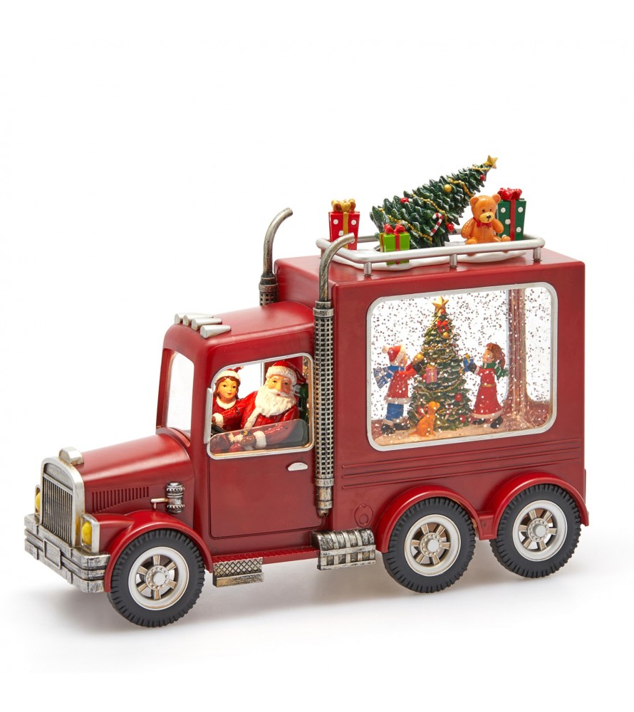 Il cuore della decorazione è il vano posteriore del camion, che racchiude una vera e propria palla di neve: all'interno, un incantevole scenetta natalizia con bambini e un albero decorato prende vita. Grazie al meccanismo interno, i glitter scintillanti vengono messi in continuo movimento, simulando una cascata di neve che non smette mai di cadere.