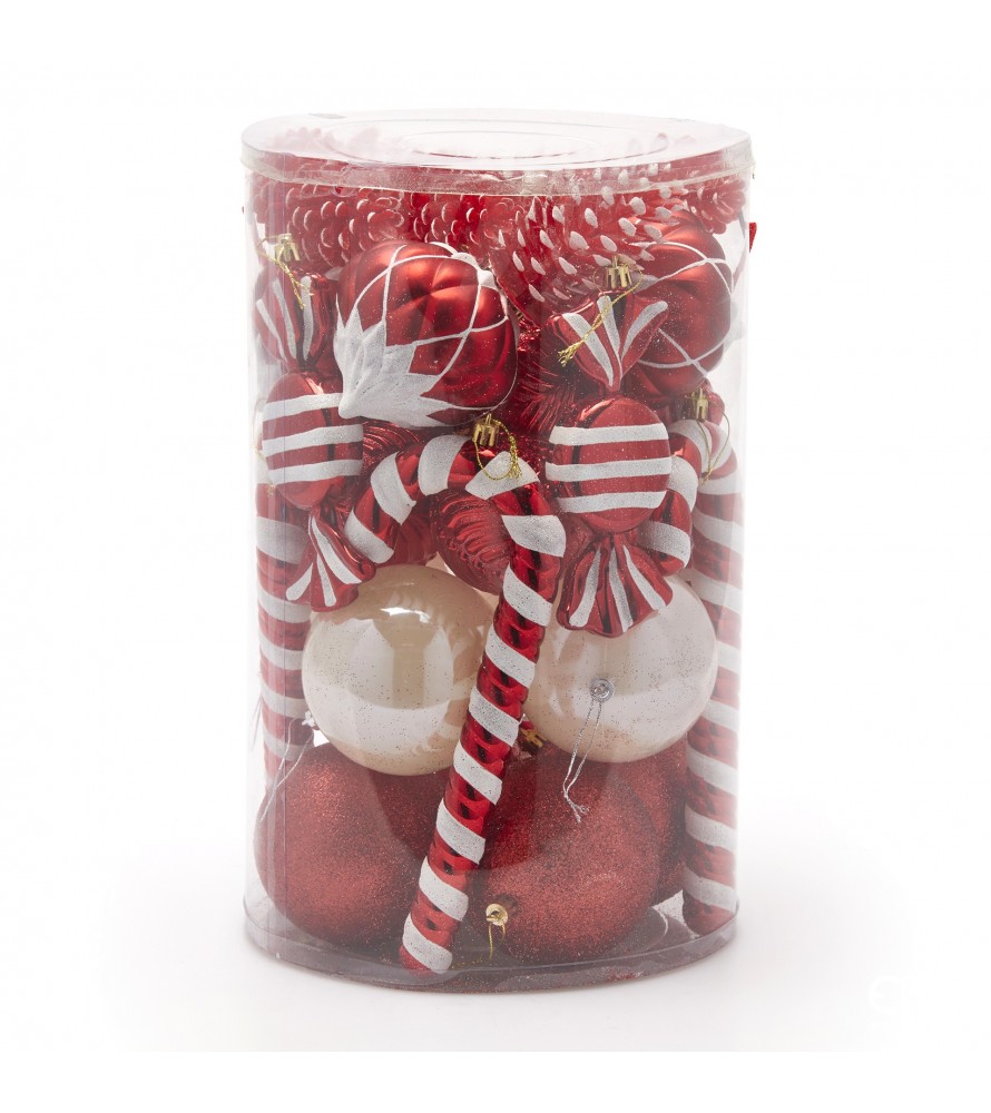 Il tema cromatico è il classico e allegro rosso e bianco, con tocchi di rosa chiaro e sfumature glitterate. La combinazione di questi colori e texture crea un effetto visivo molto ricco e festoso.Le decorazioni hanno diverse dimensioni, con un diametro di circa 10 cm e un'altezza di circa 16 cm per le decorazioni più lunghe, garantendo una composizione bilanciata sull'albero.