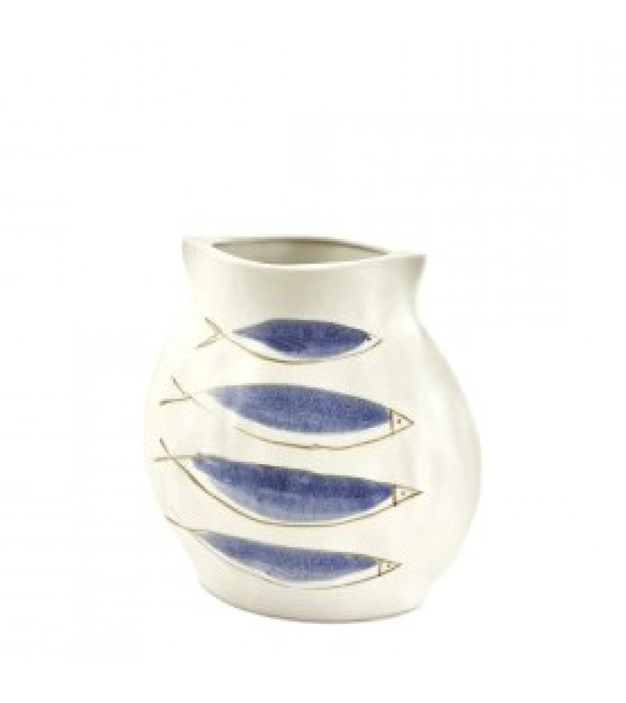 Sulla superficie candida si stagliano pesci stilizzati dipinti in azzurro, caratterizzati da linee fluide ed essenziali che sembrano muoversi con grazia sulla ceramica. Il contrasto cromatico dona al vaso un'eleganza sobria ma vivace, perfetta per arricchire interni moderni con un tocco di freschezza costiera.
