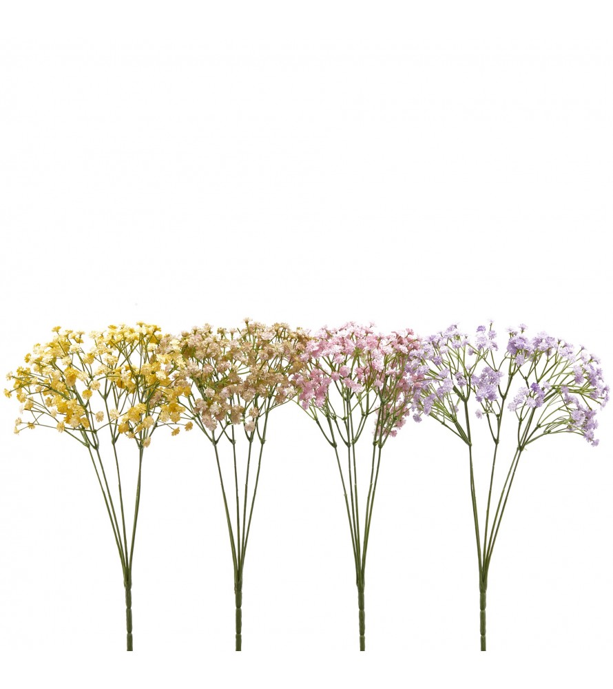 Cespugli di Gypsophila Artificiale ciascuno composto da 5 rami fioriti assortiti in 4 colori.Ideale per completare le tue composizioni floreali artificiali.