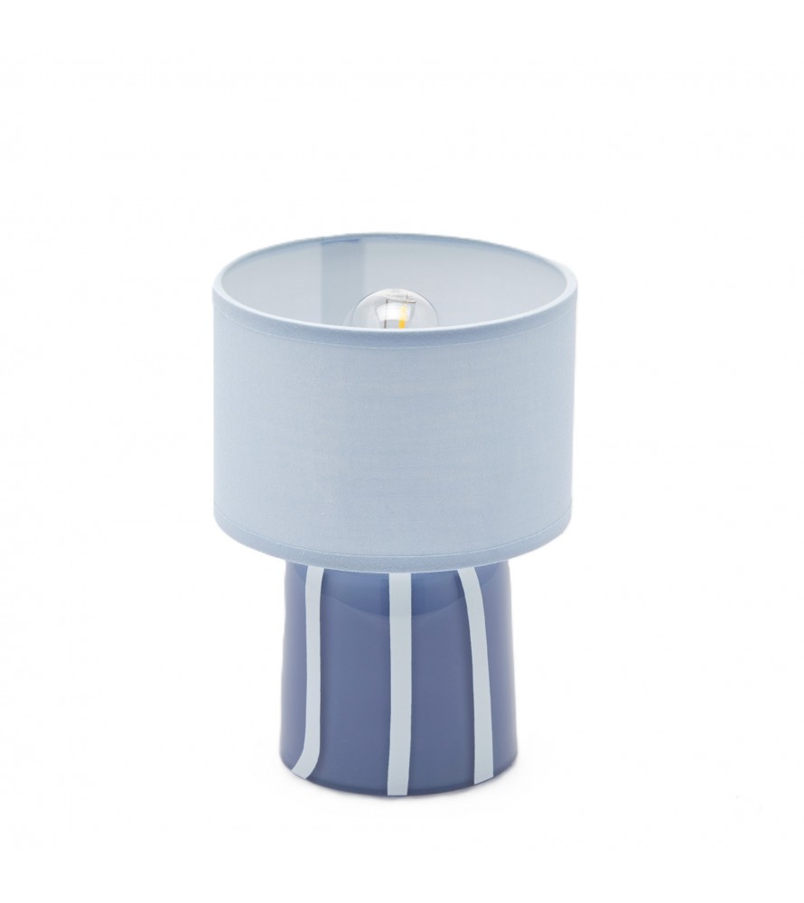 LA LAMPADA DA TAVOLO SUMMER DI ENZO DE GASPERI evoca l'eleganza luminosa delle vacanze mediterranee. La sua base in vetro, decorata con fresche righe bianco e azzurro, sorregge un paralume in fibra tessile color azzurro polvere, creando un insieme armonioso e di grande classe. Un complemento d'arredo senza fili che unisce la leggerezza del design "coastal" alla massima praticità d'uso.