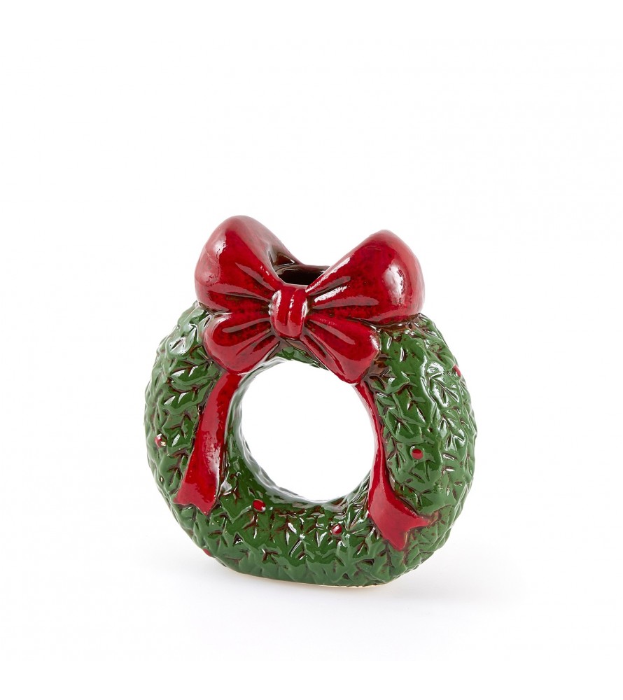 La finitura smaltata verde, con sfumature scure che ne accentuano la texture, imita perfettamente la foglia di agrifoglio, mentre le piccole bacche rosse aggiungono un tocco di colore vivace.Un grande fiocco rosso lucido, sapientemente modellato in ceramica, decora la parte superiore della ghirlanda, completando il design festoso.