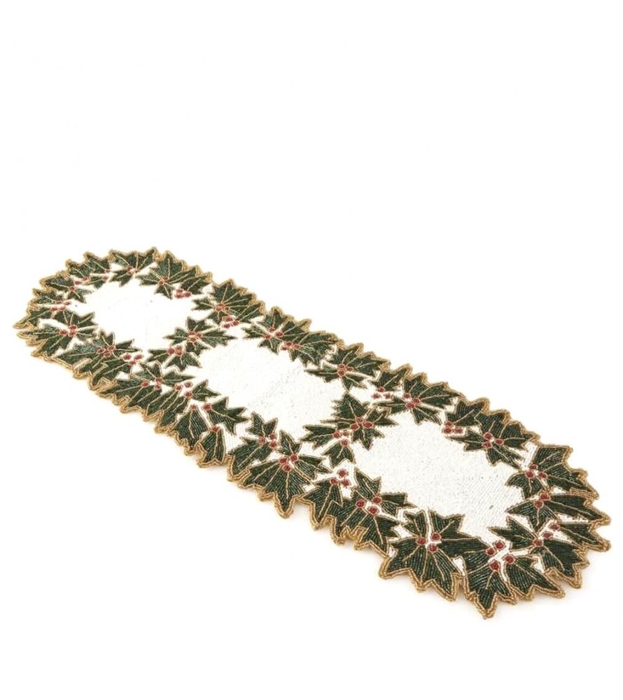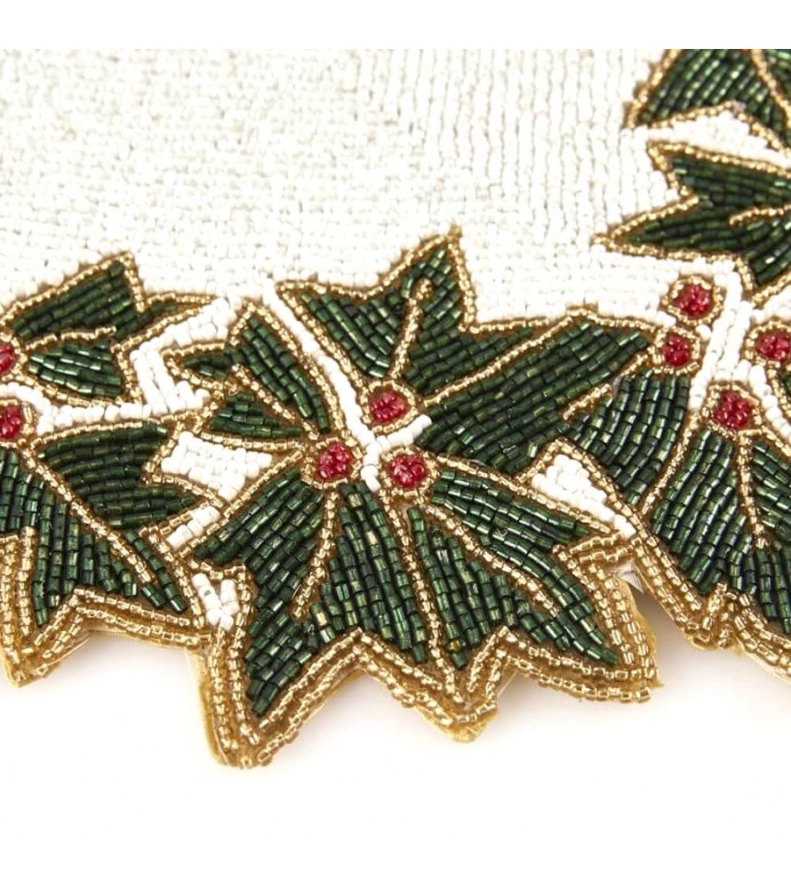 Il runner presenta una base color avorio, finemente decorata con migliaia di micro-perline che creano una superficie scintillante e preziosa.Lungo il perimetro, un elaborato motivo di foglie di agrifoglio verdi e bacche rosse aggiunge un tocco di colore e tradizione. Il contorno dorato delle foglie e il bordo sagomato e luccicante esaltano il disegno, rendendolo un vero capolavoro artigianale.