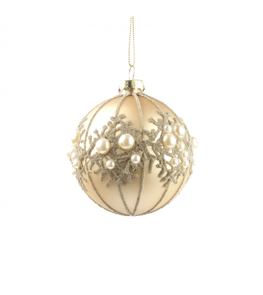 La palla presenta una base di colore light gold dal finish opaco, che serve da sfondo a un'elaborata decorazione a rilievo. Le decorazioni, a forma di motivi floreali,sono realizzate con una brillantezza dorata che contrasta splendidamente con la base. A impreziosire il tutto, perle bianche di diverse dimensioni sono applicate sulla superficie, creando un effetto tridimensionale e lussuoso.
