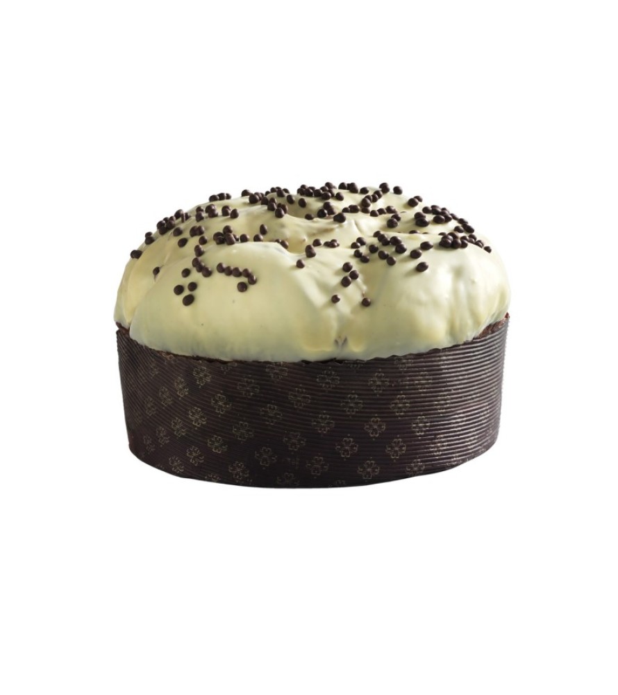 Panettone con gocce di cioccolato e pera candita ricoperto di cioccolato bianco e croccantini di cioccolato, incartato a mano.