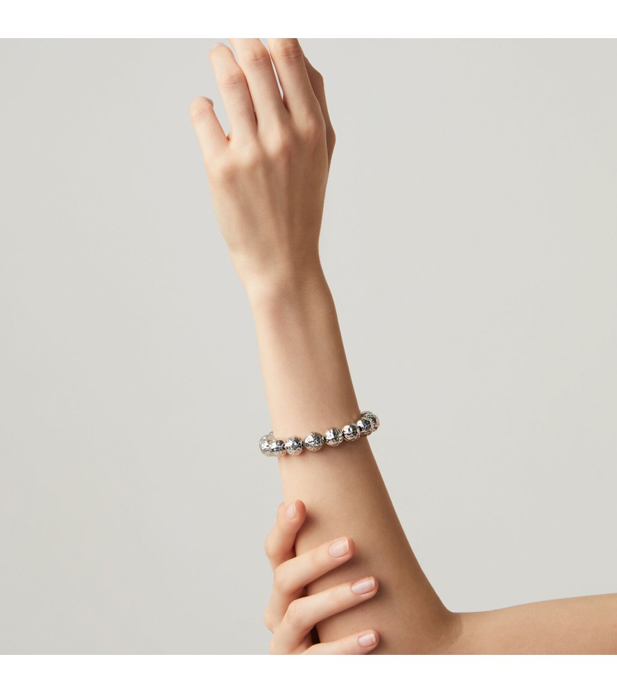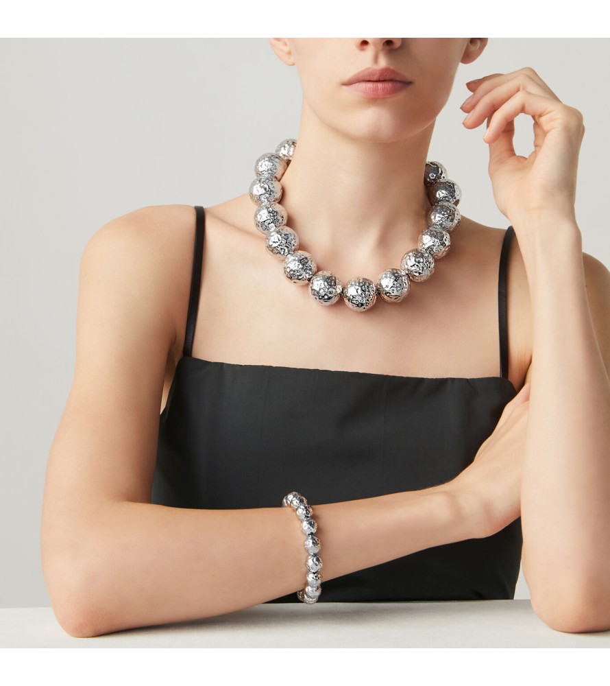 Tante sfere in argento martellato creano un bracciale che riflette la luce con bagliori di misurata eleganza. Texture preziose realizzate completamente a mano in azienda.