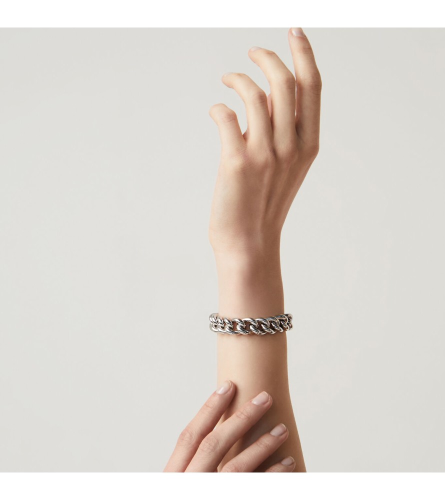 Una catena classica si trasforma in un gioiello contemporaneo luminoso ed elegante. Il bracciale Onda viene realizzato con maglie d'argento di grande impatto materico. Realizzato completamentea mano in Italia.