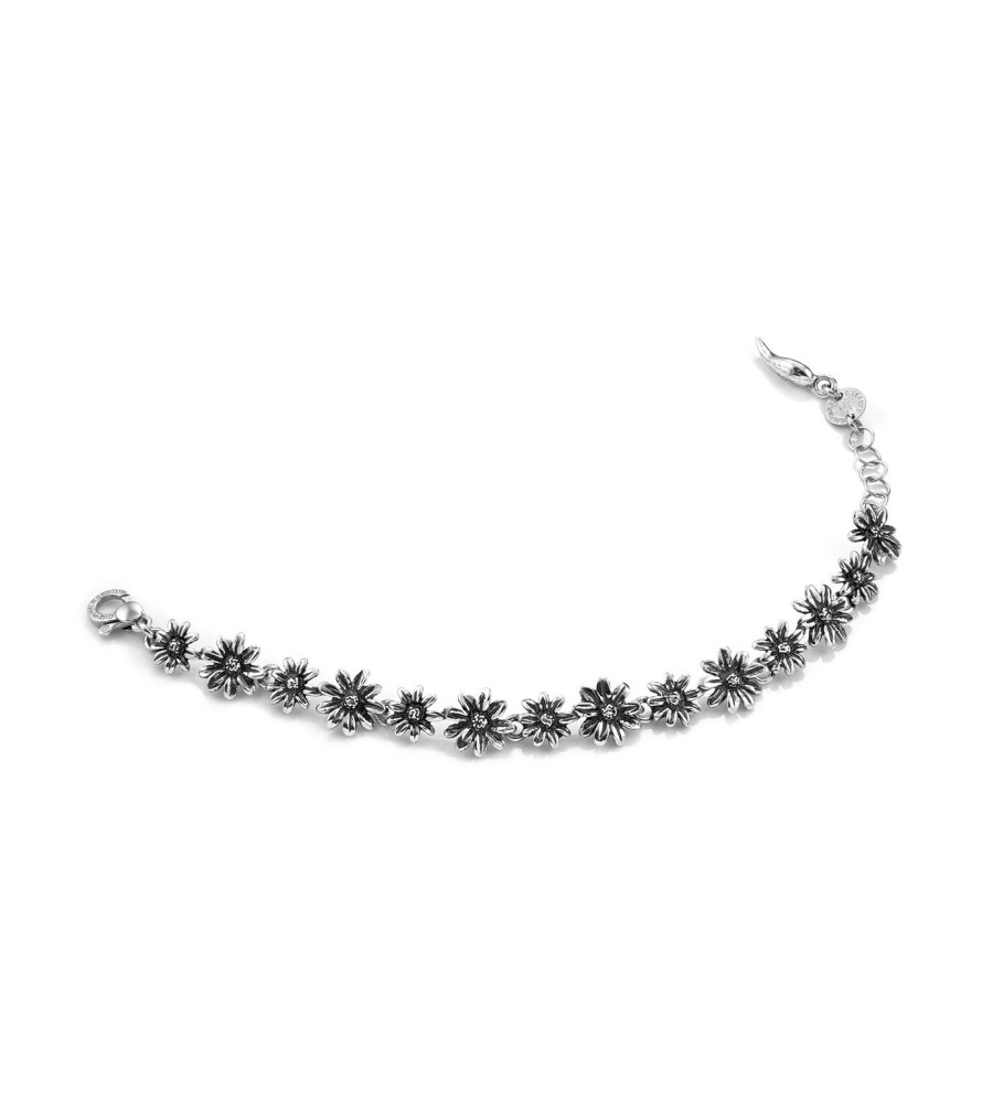 Il bracciale Mini Margherite regala tutta la delicatezza e lo stile di un gioiello Giovanni Raspini. Semplice ed elegante, fatto completamente a mano con la tecnica preziosa della fusione a cera persa, racconta storie semplici di petali d'argento brunito. Primavera da indossare sulla pelle nuda.