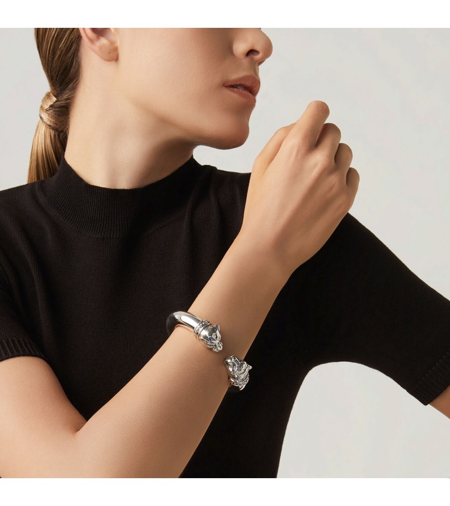 Come il bracciale Teste Leopardo in argento: due meravigliose teste di felino, realizzate con la tecnica della cera persa, che decorano il luminoso bracciale dalla forma tubolare. Un gioiello di grande indossabilità, grazie anche alla funzionale apertura a molla.