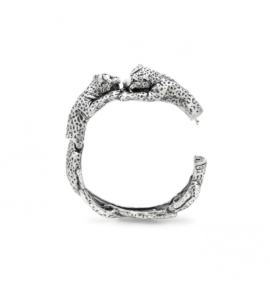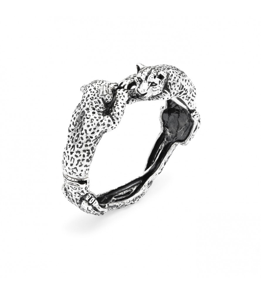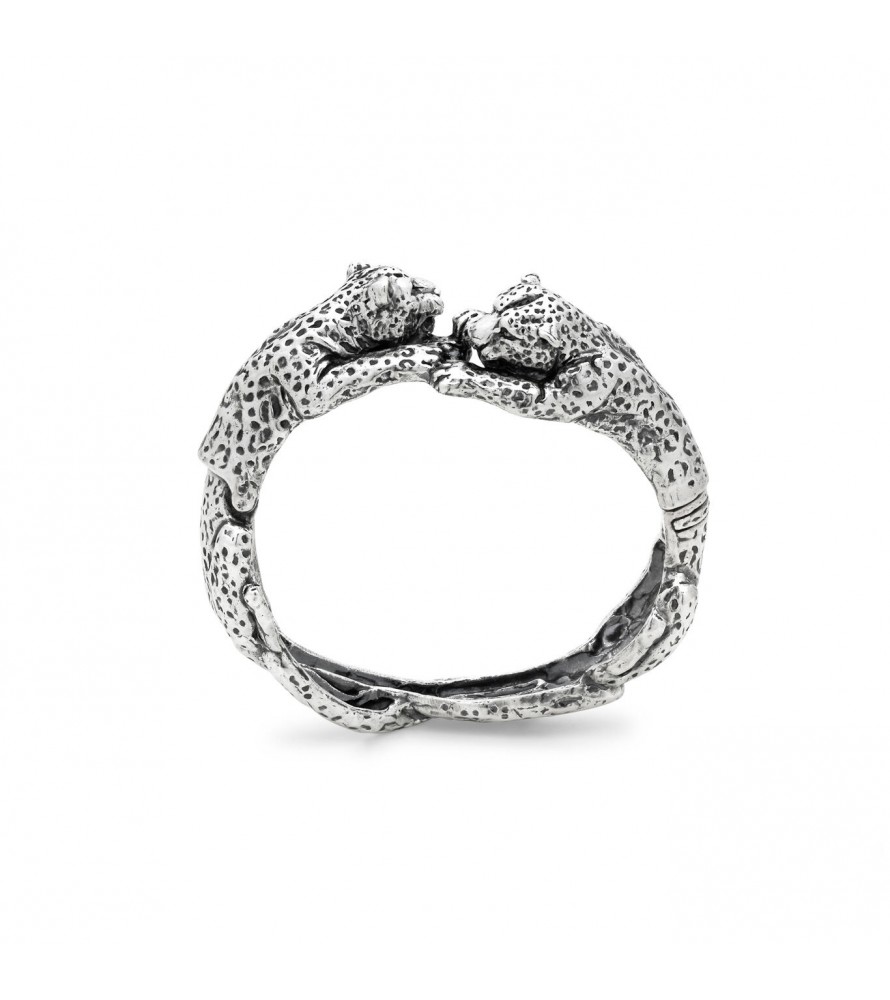 Due leopardi, languidamente adagiati uno di fronte all'altro, danno vita a questo bracciale in argento fuso a cera persa, dai volumi plastici. Iconico, per la sua capacità di fondere l'eleganza con la forza della natura. La brunitura enfatizza la texture del manto del felino, in una combinazione perfetta di forma e luminosità. Realizzati a mano in azienda.