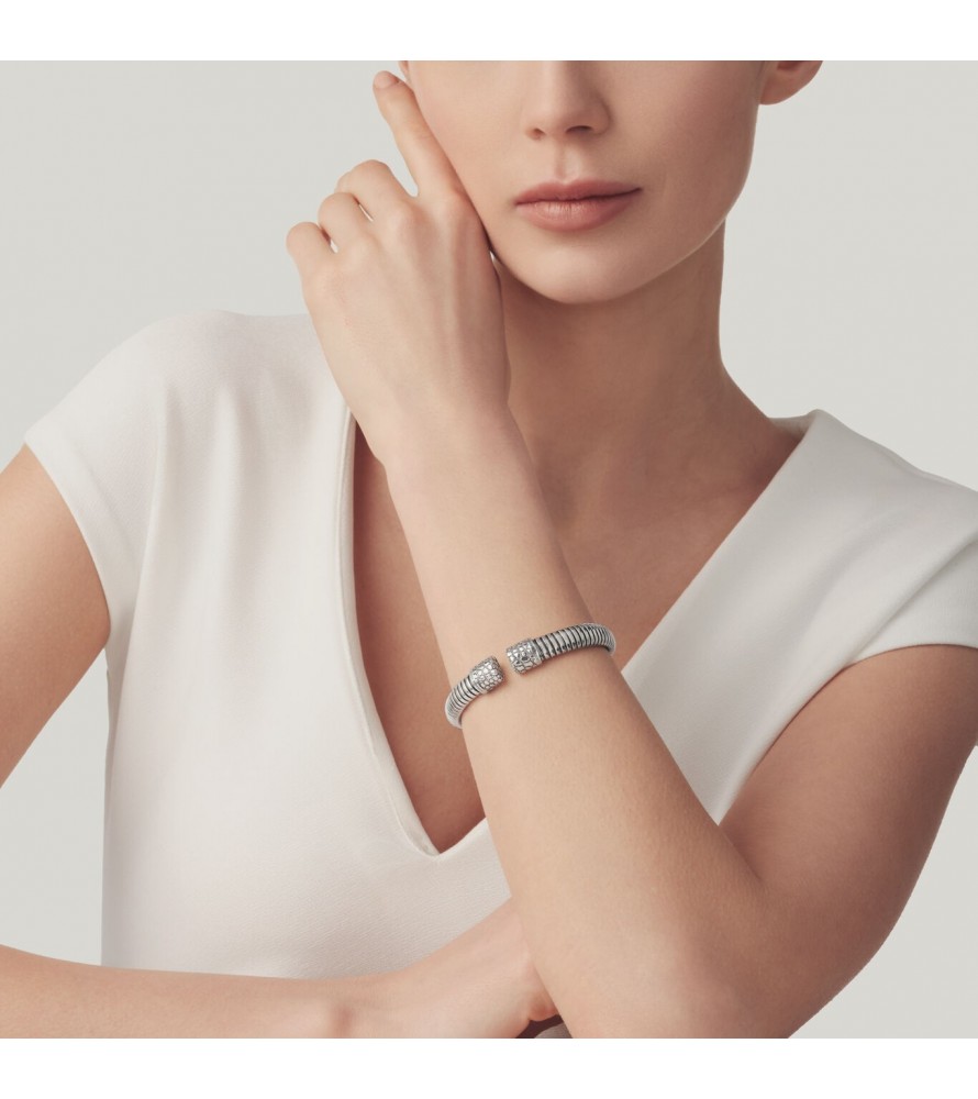 Un gioiello intramontabile, dal carattere deciso. Per indossare il bracciale consigliamo di farlo scorrere dolcemente sulla pelle allargandolo al minimo al fine di mantenerne inalterata la struttura.