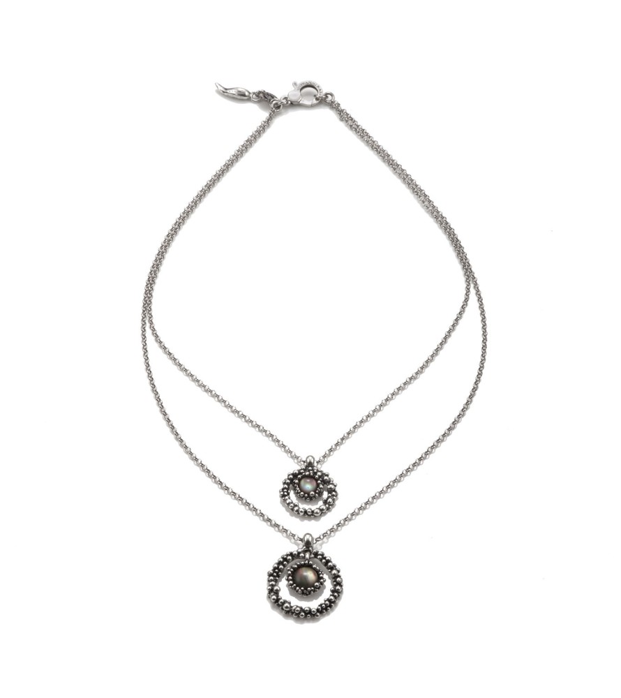 Delicati cerchi di sferette d'argento incorniciano due madreperle doppiate con il quarzo e danno vita a questa collana a doppio pendente. I riflessi cangianti rosa, verdi e cilestrini ricordano i colori dell'alba riflessa sull'oceano, ispirazione della Collezione Maui.