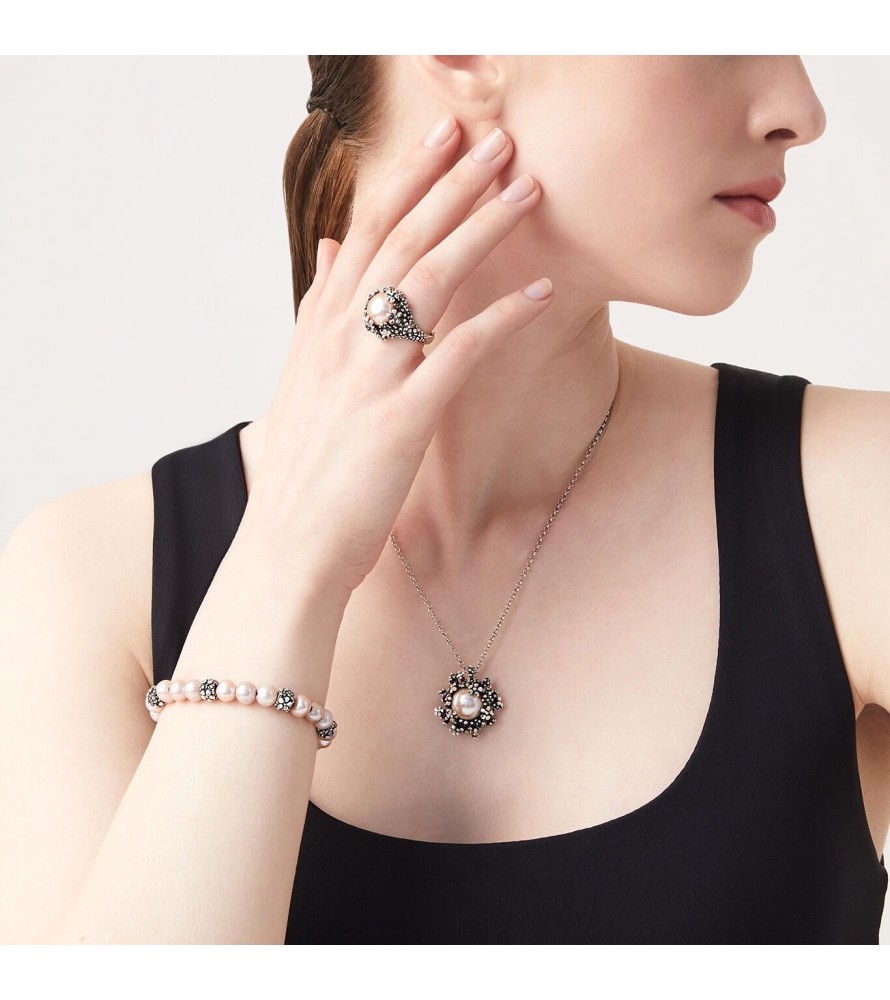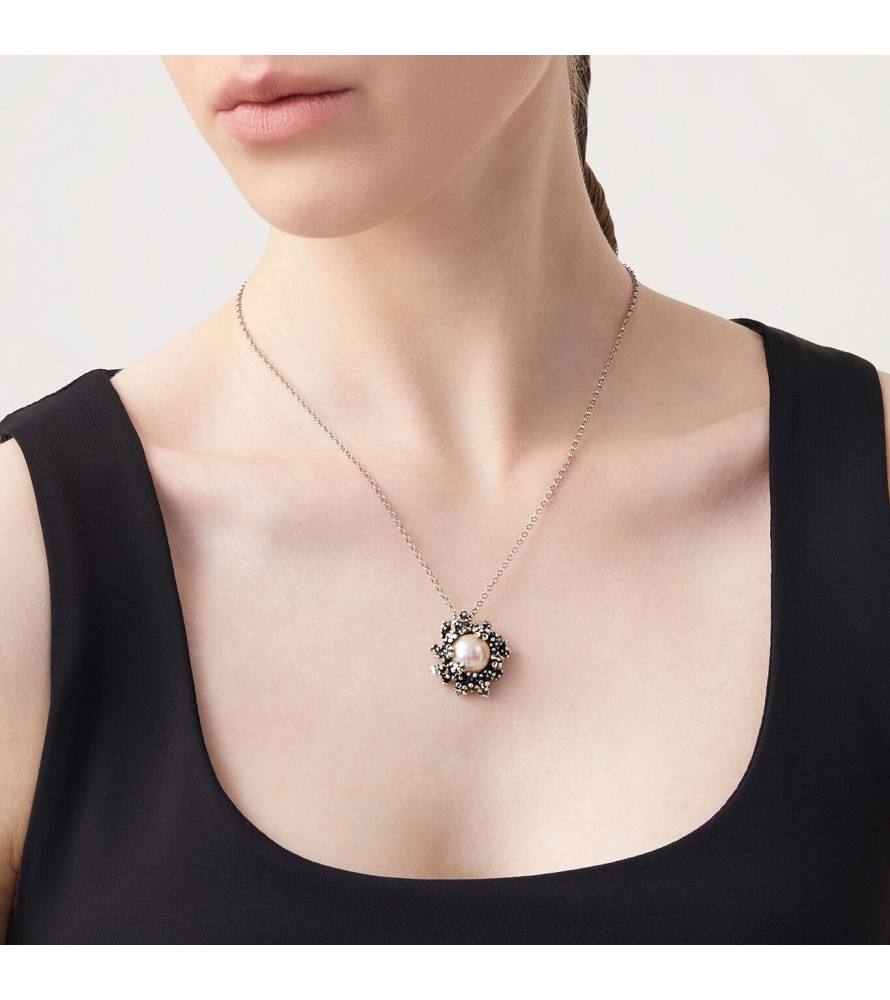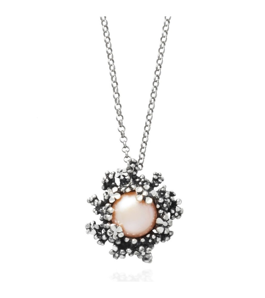 Incastonata in un decoro floreale in argento brunito, la grande perla rosa naturale d'acqua dolce si trasforma in questo pendente elegantissimo e luminoso. L'argento brunito è lavorato a mano con fusione a cera persa, ed è reso ancora più lucente grazie alla diamantatura posta sui petali dei micro fiorellini.