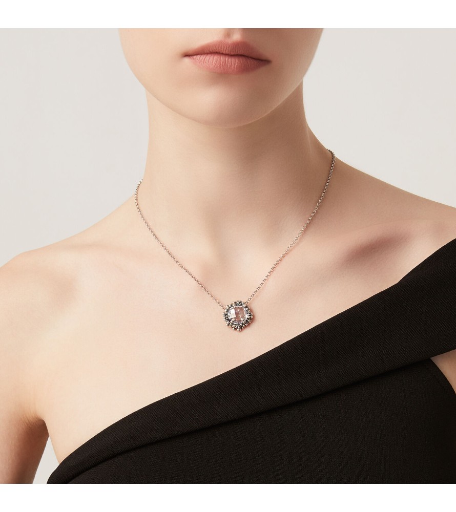 Questo delicato pendente monta un grande zircone trasparente che illumina l'argento che lo incastona. Leggero e contemporaneo, è abbinato ad una collana da 45 centimetri, per illuminare il volto grazie alla purezza della luce.