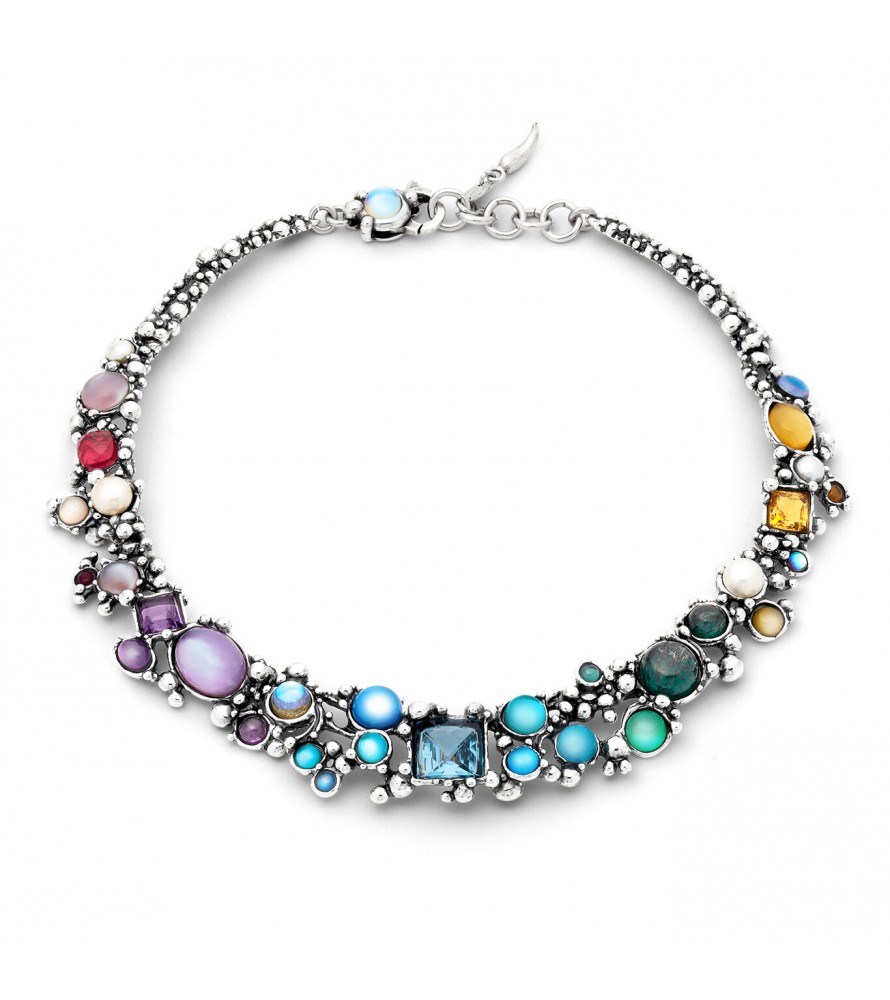 - Un gioiello in edizione limitata che custodisce un'immensa ricchezza di stile. L'argento brunito, con un decoro naturalistico di sferette ramificate, dialoga con pietre naturali, gemme e perle naturali di acqua dolce, creando un gioiello importante e luminosissimo, ulteriormente impreziosito dal moschettone adornato da un quarzo Mystic iridescente.