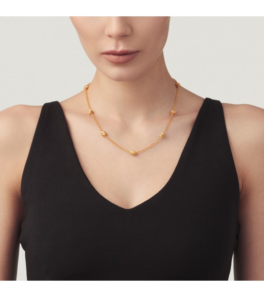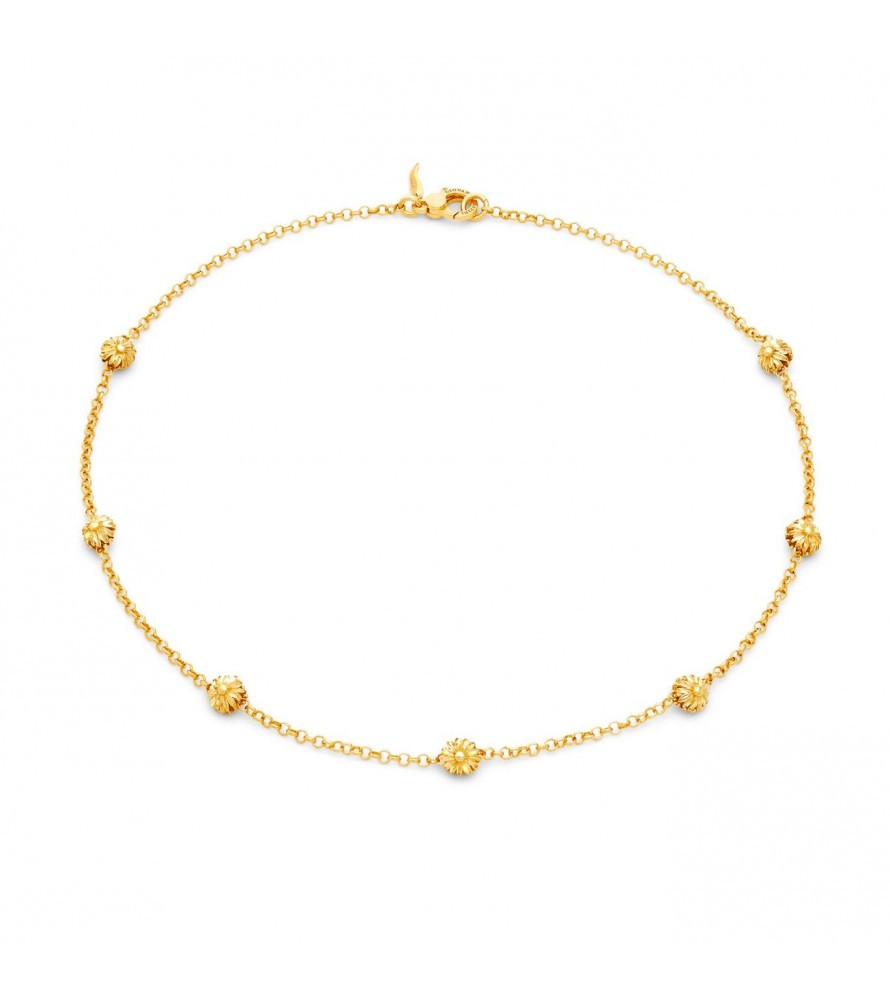 In questa collana in argento dorato, le margherite sono diamantate a mano petalo per petalo e vanno ad abbracciare in modo ritmato la catena mini-rolò di 45 cm.