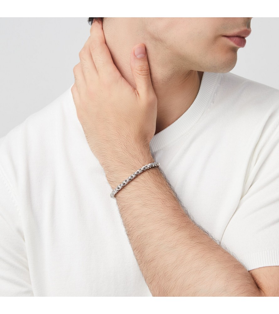 Classica e rivisitata, questa catena treccia in argento si trasforma in un bracciale sobrio e comodissimo da indossare. Tutta l'eleganza e la luminosità di un metallo nobile che non invecchia mai.
