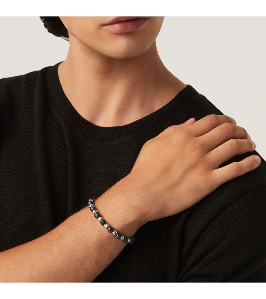 Materiali, nuove idee e tante proposte per un gioiello maschile luminoso e contemporaneo. Il bracciale Sfere Diaspro è realizzato alternando le sfere di diaspro verde con le sferette d'argento martellato, fra luce ed ombra.