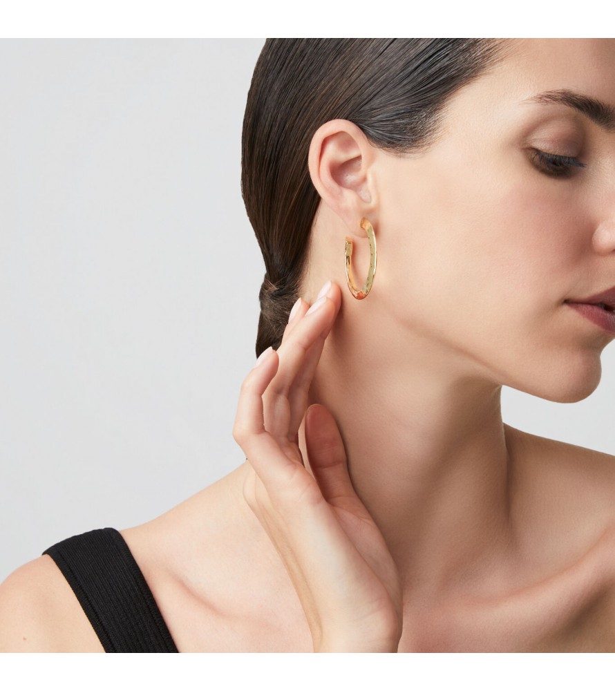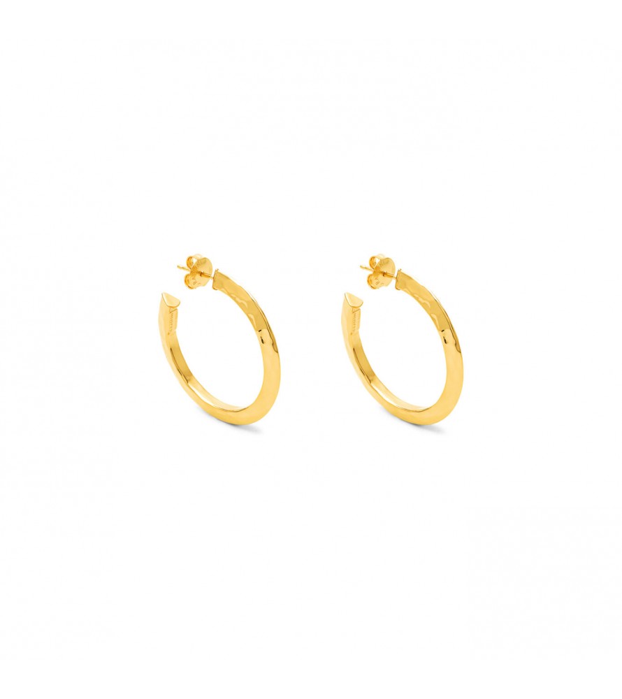 - Questi orecchini a cerchio, dalla sezione triangolare e con una texture che riflette una luce intensa, sono parte della collezione Blade. Ogni gioiello è progettato per un look deciso e rock, realizzato in azienda con una lastra d'argento martellata a mano.